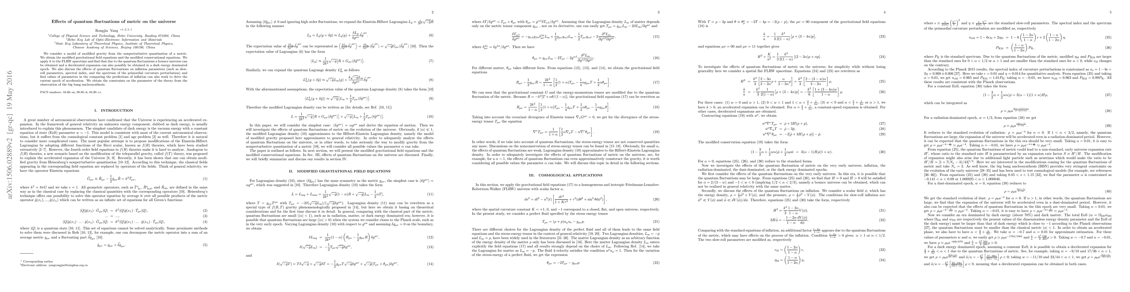 We consider a model of modified gravity from the nonperturbative quantization of a metric. We obtain the modified gravitational field equations and the modified conservational equations. We apply it to the FLRW spacetime and find that due to the quantum fluctuations a bounce universe can be obtained and a decelerated expansion can also possibly be obtained in a dark energy dominated epoch. We also discuss the effects of quantum fluctuations on inflation parameters (such as slow-roll parameters, spectral index, and the spectrum of the primordial curvature perturbation) and find values of parameters in the comparing the predictions of inflation can also work to drive the current epoch of acceleration. We obtain the constraints on the parameter of the theory from the observation of the big bang nucleosynthesis.