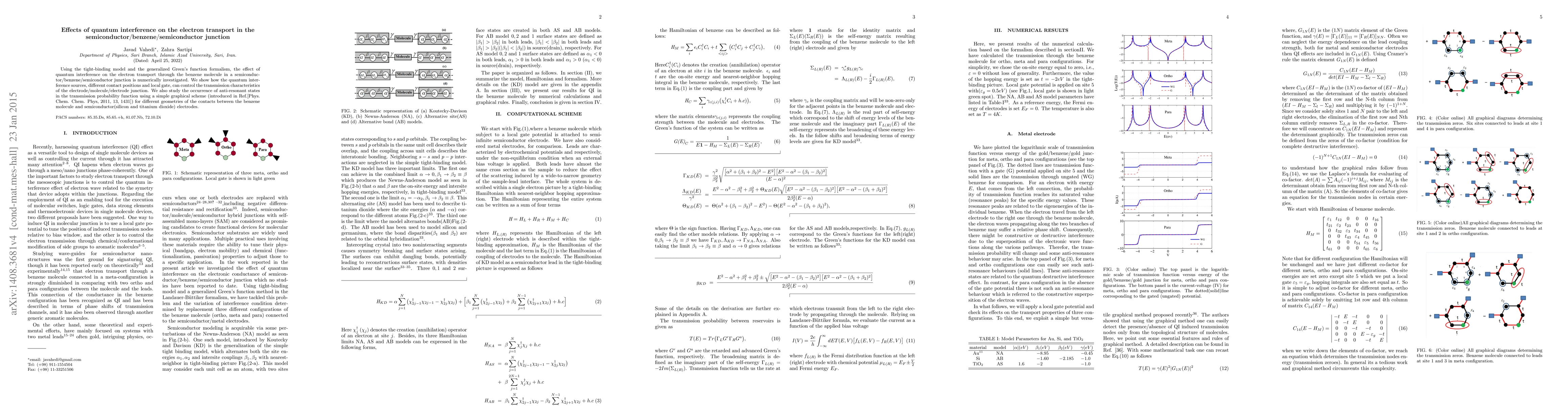This study investigates quantum interference effects on electron transport through a benzene molecule in a semiconductor/benzene/semiconductor junction using tight-binding and generalized Green's function methods. The research demonstrates how varying contact positions and local gates can control transmission characteristics and identifies anti-resonant states in the transmission probability function for different contact geometries.