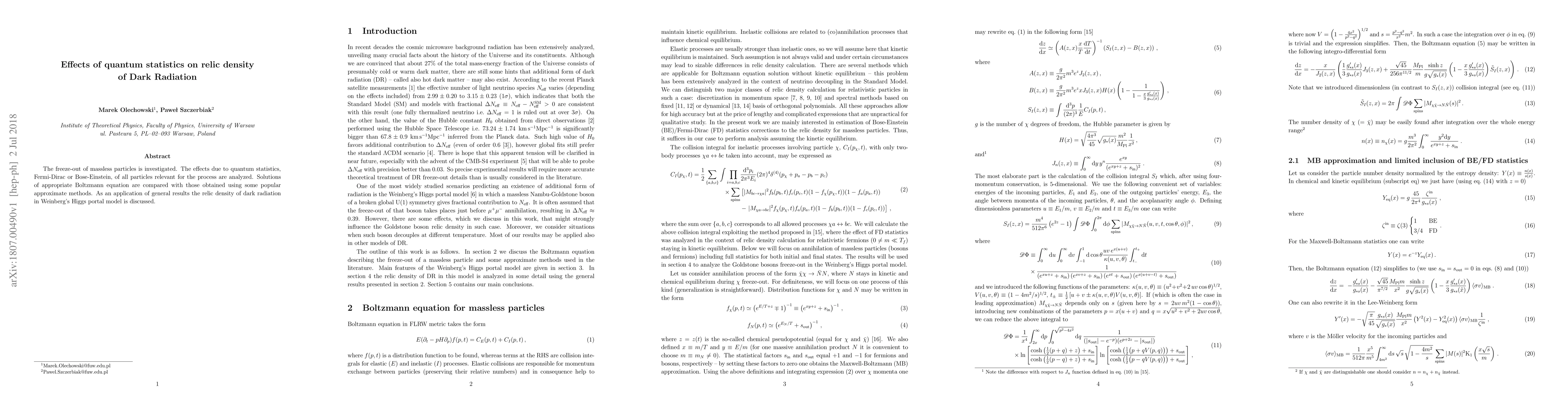 The freeze-out of massless particles is investigated. The effects due to quantum statistics, Fermi-Dirac or Bose-Einstein, of all particles relevant for the process are analyzed. Solutions of appropriate Boltzmann equation are compared with those obtained using some popular approximate methods. As an application of general results the relic density of dark radiation in Weinberg's Higgs portal model is discussed.