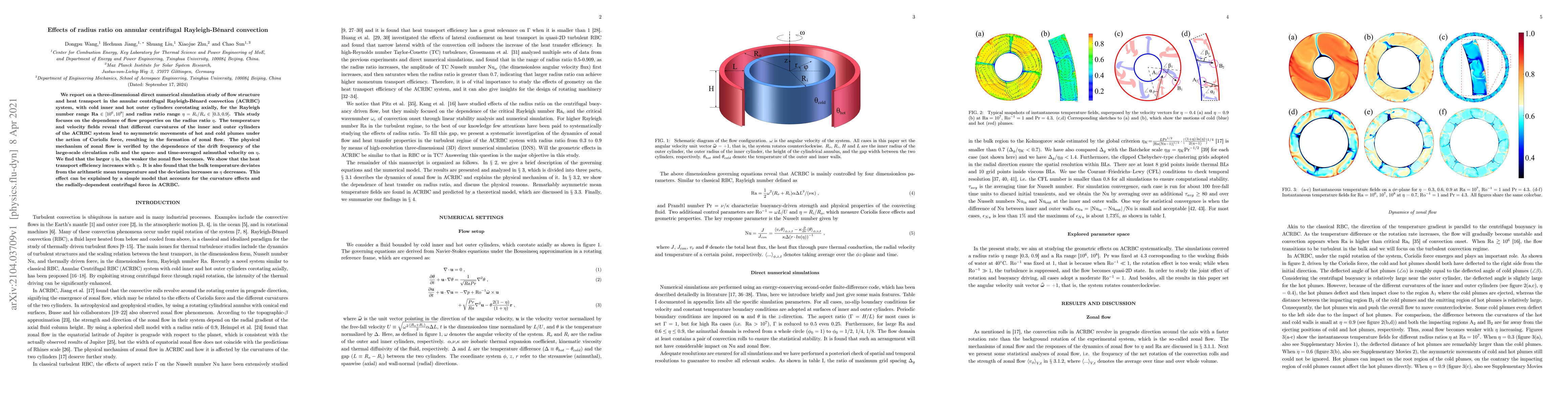 We report on a three-dimensional direct numerical simulation study of flow structure and heat transport in the annular centrifugal Rayleigh-B\'{e}nard convection (ACRBC) system, with cold inner and hot outer cylinders corotating axially, for the Rayleigh number range Ra $ \in [{10^6},{10^8}]$ and radius ratio range $\eta = {R_i}/{R_o} \in [0.3,0.9]$. This study focuses on the dependence of flow properties on the radius ratio $\eta$. The temperature and velocity fields reveal that different curvatures of the inner and outer cylinders of the ACRBC system lead to asymmetric movements of hot and cold plumes under the action of Coriolis force, resulting in the formation of zonal flow. The physical mechanism of zonal flow is verified by the dependence of the drift frequency of the large-scale circulation rolls and the space- and time-averaged azimuthal velocity on $\eta$. We find that the larger $\eta$ is, the weaker the zonal flow becomes. We show that the heat transport efficiency increases with $\eta$. It is also found that the bulk temperature deviates from the arithmetic mean temperature and the deviation increases as $\eta$ decreases. This effect can be explained by a simple model that accounts for the curvature effects and the radially-dependent centrifugal force in ACRBC.