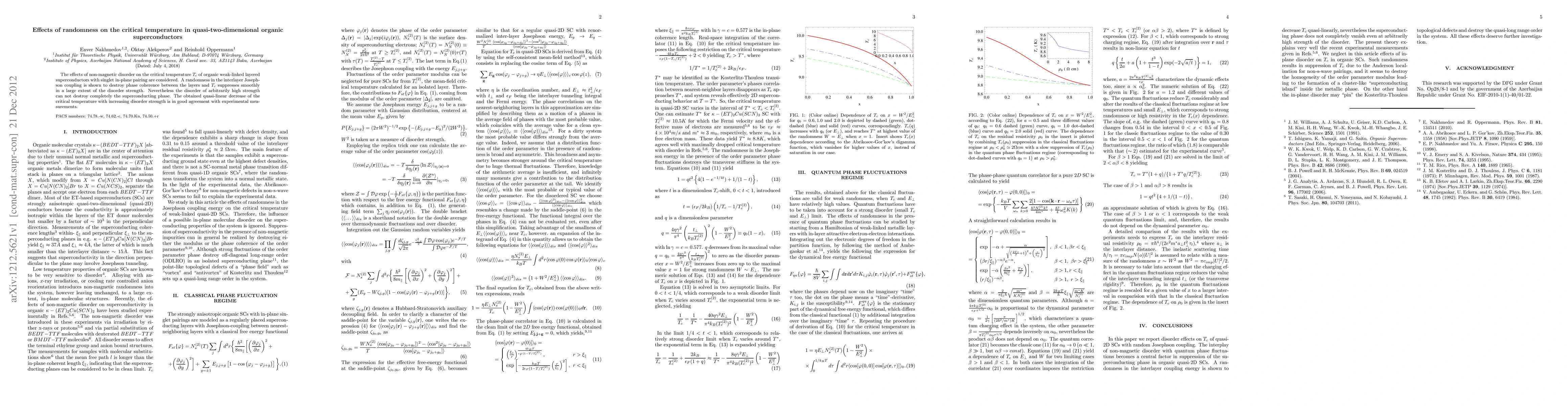 This study investigates how non-magnetic disorder impacts the critical temperature T_c in quasi-two-dimensional organic superconductors, revealing that increased randomness in interlayer Josephson coupling reduces T_c but does not completely destroy superconductivity, with a quasi-linear decrease matching experimental observations.