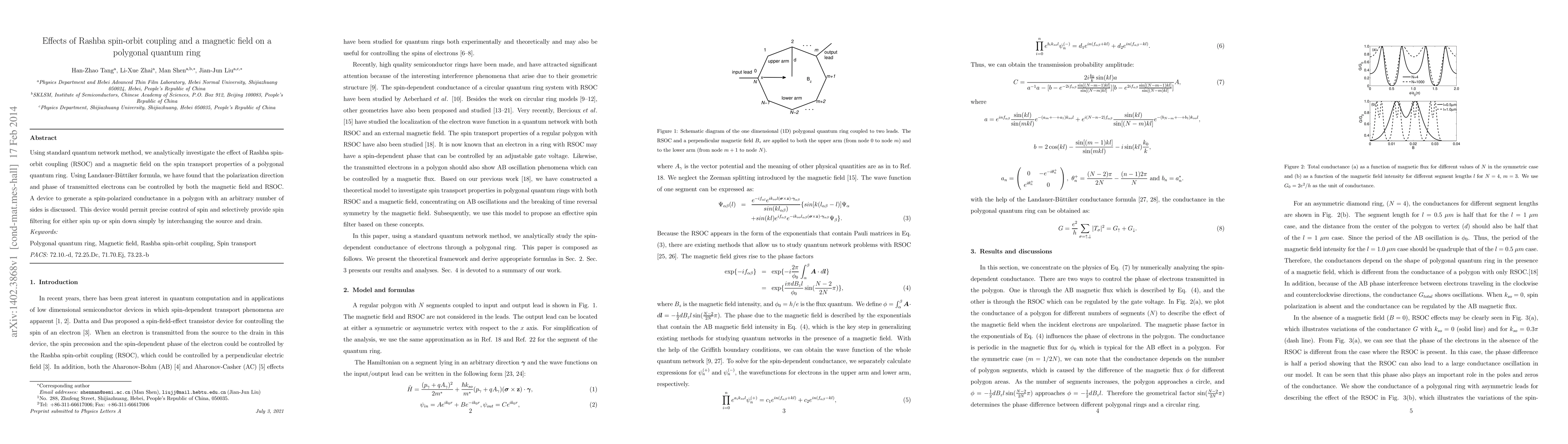 This paper analytically explores the influence of Rashba spin-orbit coupling and a magnetic field on spin transport in a polygonal quantum ring using the quantum network method. The study reveals that both factors can control the polarization direction and phase of transmitted electrons, enabling the design of a device capable of generating spin-polarized conductance and selective spin filtering.