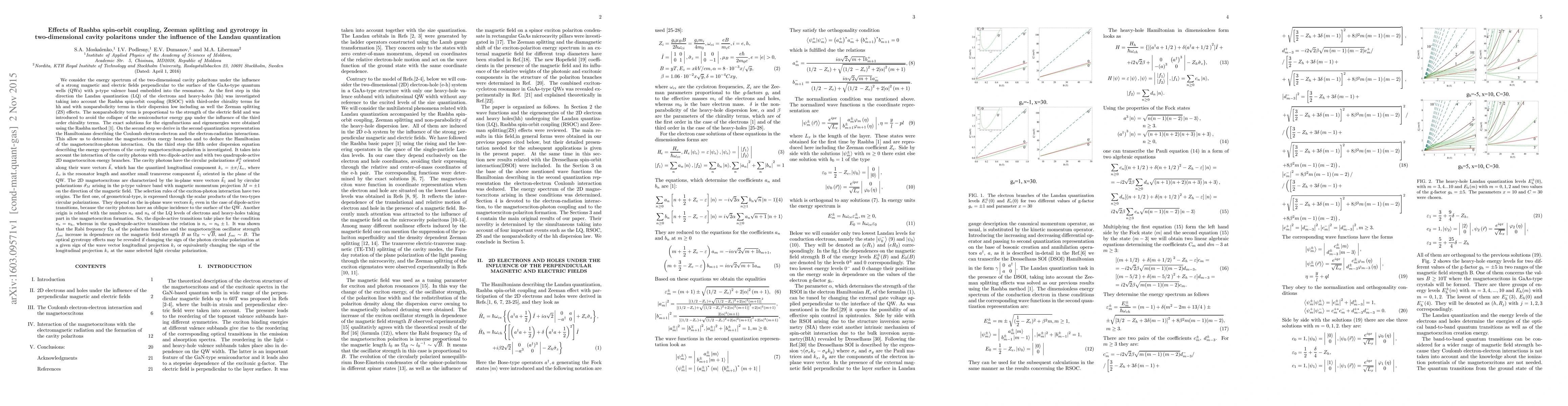 GaAs-type quantum wells (QWs) with p-type valence band embedded into the resonators. The Landau quantization of the electrons and heavy-holes (hh) was investigated taking into account the Rashba spin-orbit coupling with third-order chirality terms for hh and with nonparabolicity terms in their dispersion low including the Zeeman splitting (ZS) effects. The exact solutions for the eigenfunctions and eigenenergies were obtained using the Rashba method [1]. We derive in the second quantization representation the Hamiltonians describing the Coulomb electron-electron and the electron-radiation interactions and determine the magnetoexciton energy branches and the magnetoexciton-photon interaction. The fifth order dispersion equation describing the energy spectrum of the cavity magnetoexciton-polariton is investigated. It takes into account the interaction of the cavity photons with two dipole-active and with two quadrupole-active 2D magnetoexciton energy branches. The cavity photons have the circular polarizations oriented along their wave vectors, which has the quantized longitudinal component. The selection rules of the exciton-photon interaction is expressed through the scalar products of the two-types circular polarizations and it is related with the numbers of the LQ levels of electrons and heavy-holes. It is shown that the Rabi frequency of the polariton branches and the magnetoexciton oscillator strength increase in dependence on the magnetic field strength. The optical gyrotropy effects may be revealed if changing the sign of the photon circular polarization at a given sign of the wave vector longitudinal projection or equivalently changing the sign of the longitudinal projection at the same selected light circular polarization.