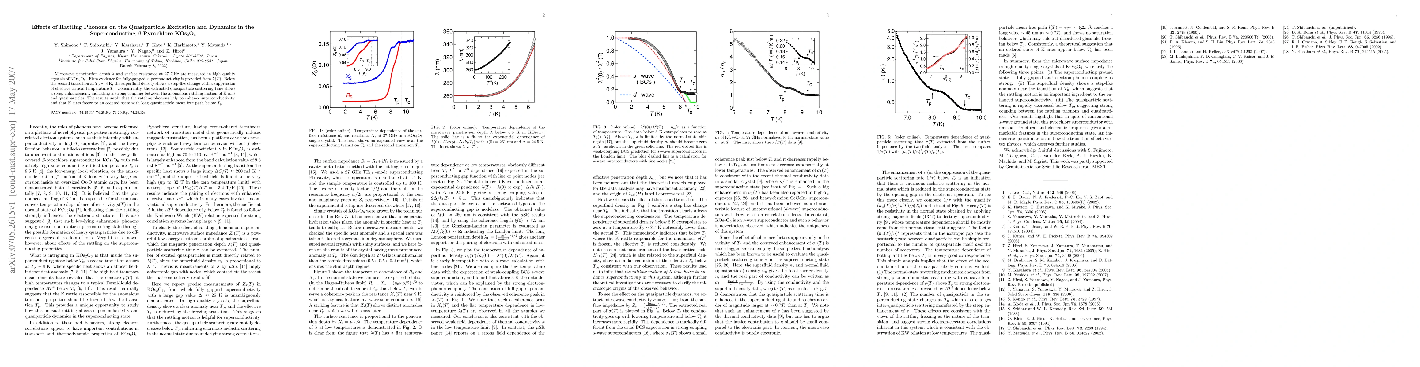 This study reveals that rattling phonons in KOs$_2$O$_6$ enhance superconductivity by strongly coupling with quasiparticles, leading to a step-like change in superfluid density and a steep increase in quasiparticle scattering time below $T_{\rm p}\sim 8$ K. The findings suggest that K ion rattling phonons play a crucial role in the superconducting dynamics.