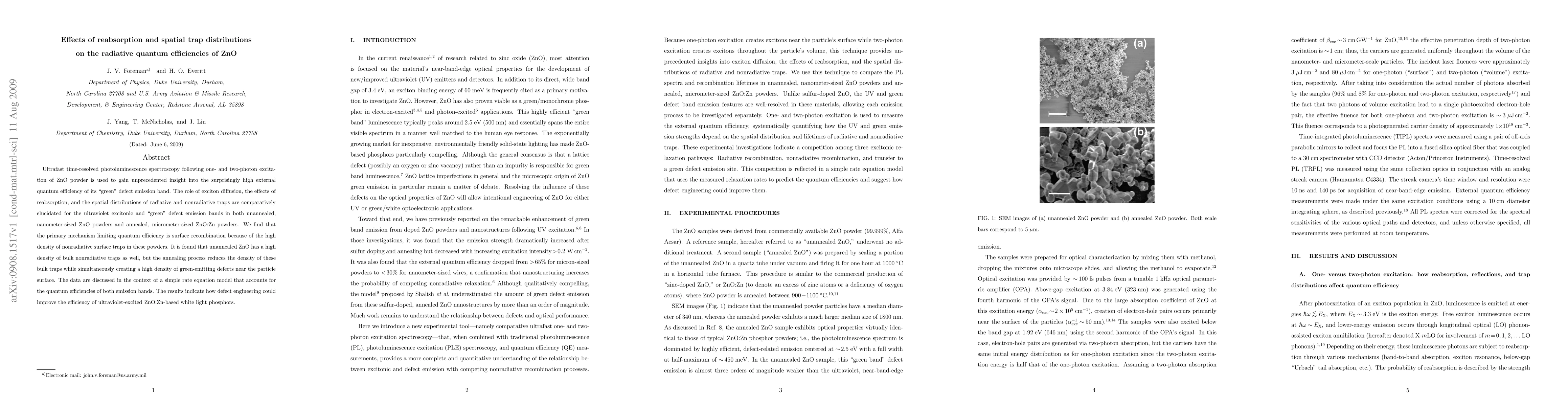 Ultrafast time-resolved photoluminescence spectroscopy following one- and two-photon excitation of ZnO powder is used to gain unprecedented insight into the surprisingly high external quantum efficiency of its "green" defect emission band. The role of exciton diffusion, the effects of reabsorption, and the spatial distributions of radiative and nonradiative traps are comparatively elucidated for the ultraviolet excitonic and "green" defect emission bands in both unannealed, nanometer-sized ZnO powders and annealed, micrometer-sized ZnO:Zn powders. We find that the primary mechanism limiting quantum efficiency is surface recombination because of the high density of nonradiative surface traps in these powders. It is found that unannealed ZnO has a high density of bulk nonradiative traps as well, but the annealing process reduces the density of these bulk traps while simultaneously creating a high density of green-emitting defects near the particle surface. The data are discussed in the context of a simple rate equation model that accounts for the quantum efficiencies of both emission bands. The results indicate how defect engineering could improve the efficiency of ultraviolet-excited ZnO:Zn-based white light phosphors.