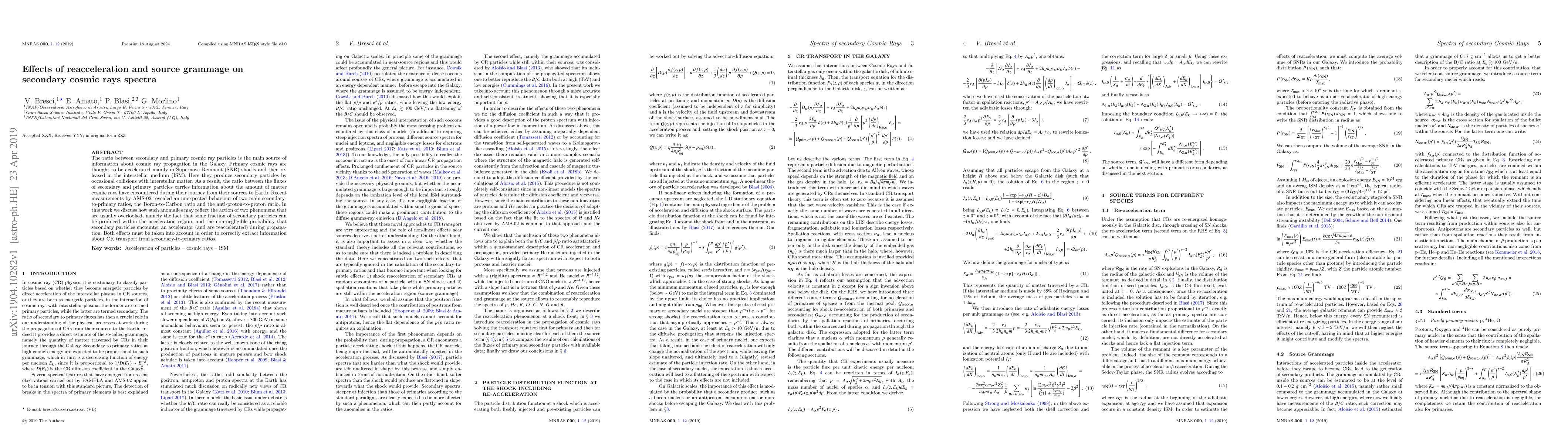 This paper investigates how reacceleration of secondary cosmic rays and their source grammage impact the spectra of secondary cosmic rays, aiming to explain anomalies in the Boron-to-Carbon and anti-proton-to-proton ratios observed by AMS-02. The study highlights the importance of considering secondary particles produced within acceleration regions and their potential reacceleration during propagation.
