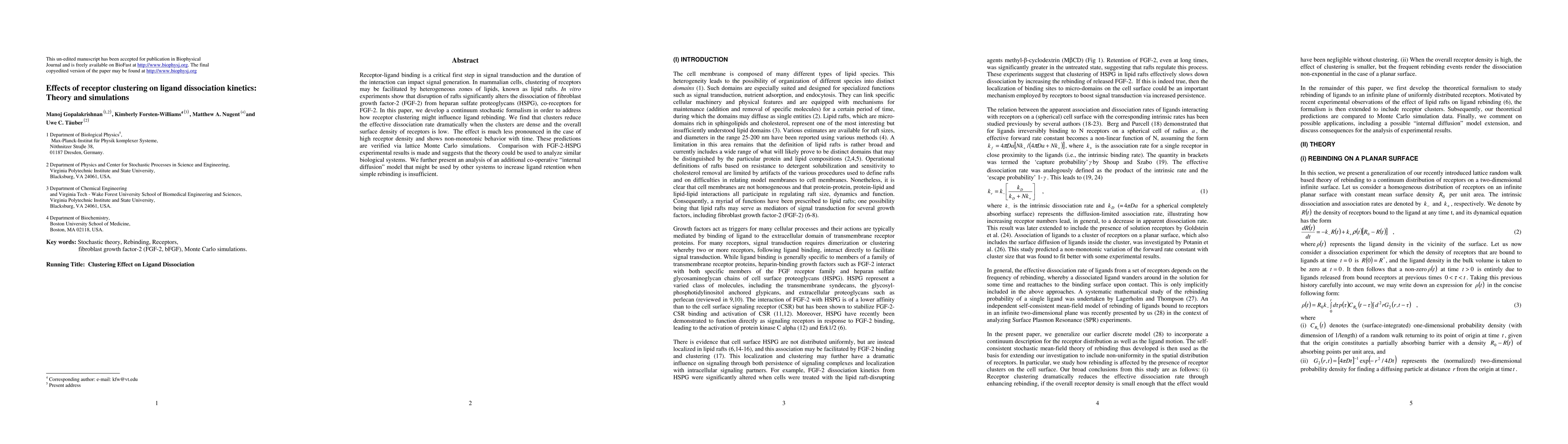 This paper develops a theoretical and simulation model to study how receptor clustering affects ligand dissociation, finding that dense clusters significantly reduce dissociation rates when receptor density is low. The study suggests additional cooperative mechanisms may be at play, proposing an "internal diffusion" model for further investigation.