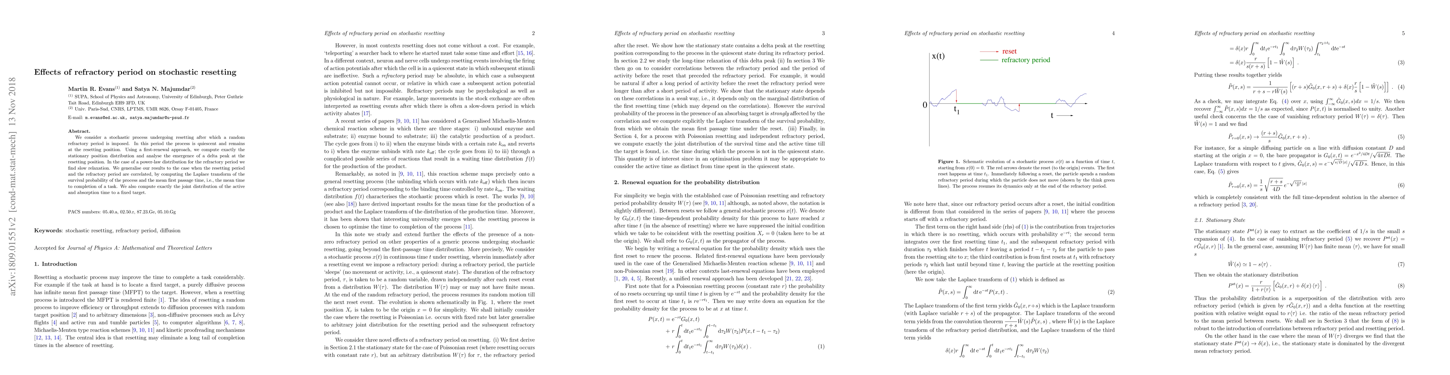This paper investigates a stochastic process with resetting followed by a random refractory period, determining the stationary position distribution and the emergence of a delta peak at the resetting position. It also explores slow relaxation under power-law refractory periods and generalizes findings for correlated resetting and refractory periods, analyzing survival probability and mean first passage time.