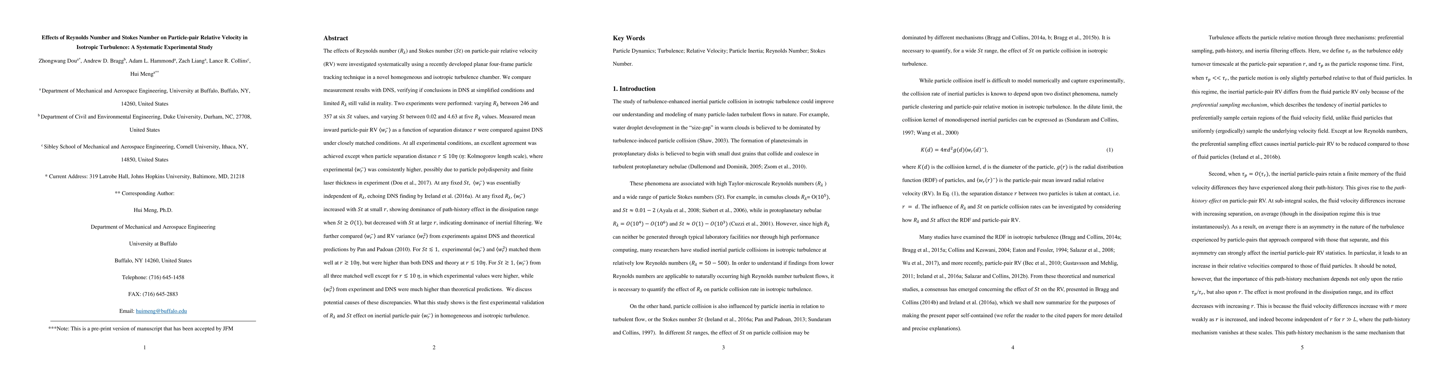 The effects of Reynolds number and Stokes number on particle-pair relative velocity (RV) were investigated systematically using a recently developed planar four-frame particle tracking technique in a novel homogeneous and isotropic turbulence chamber.