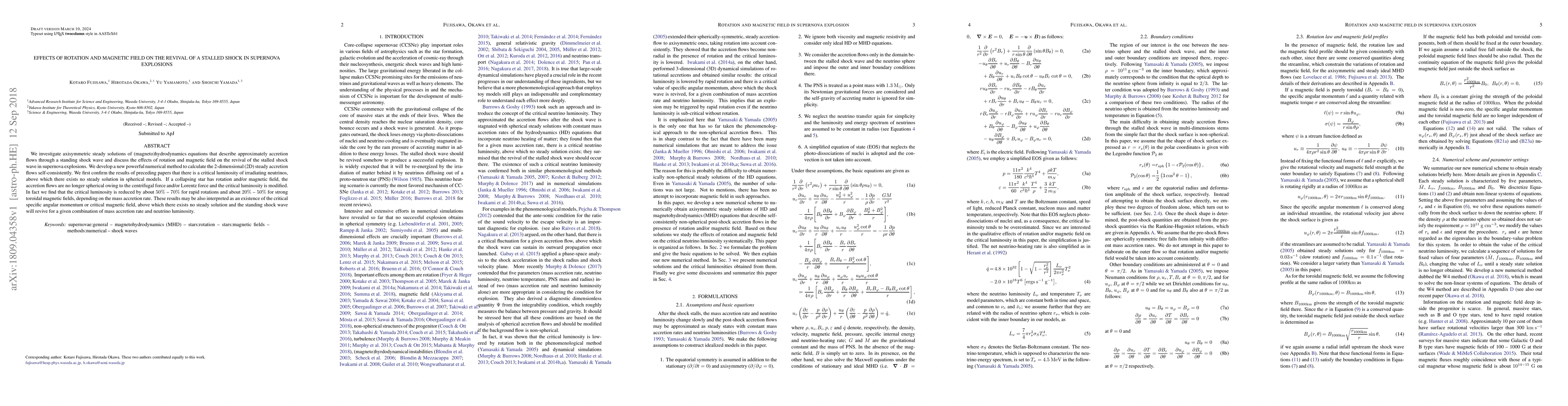 We investigate axisymmetric steady solutions of (magneto)hydrodynamics equations that describe approximately accretion flows through a standing shock wave and discuss the effects of rotation and magnetic field on the revival of the stalled shock wave in supernova explosions. We develop a new powerful numerical method to calculate the 2-dimensional (2D) steady accretion flows self-consistently. We first confirm the results of preceding papers that there is a critical luminosity of irradiating neutrinos, above which there exists no steady solution in spherical models. If a collapsing star has rotation and/or magnetic field, the accretion flows are no longer spherical owing to the centrifugal force and/or Lorentz force and the critical luminosity is modified.In fact we find that the critical luminosity is reduced by about 50% - 70% for rapid rotations and about 20% - 50% for strong toroidal magnetic fields, depending on the mass accretion rate. These results may be also interpreted as an existence of the critical specific angular momentum or critical magnetic field, above which there exists no steady solution and the standing shock wave will revive for a given combination of mass accretion rate and neutrino luminosity.