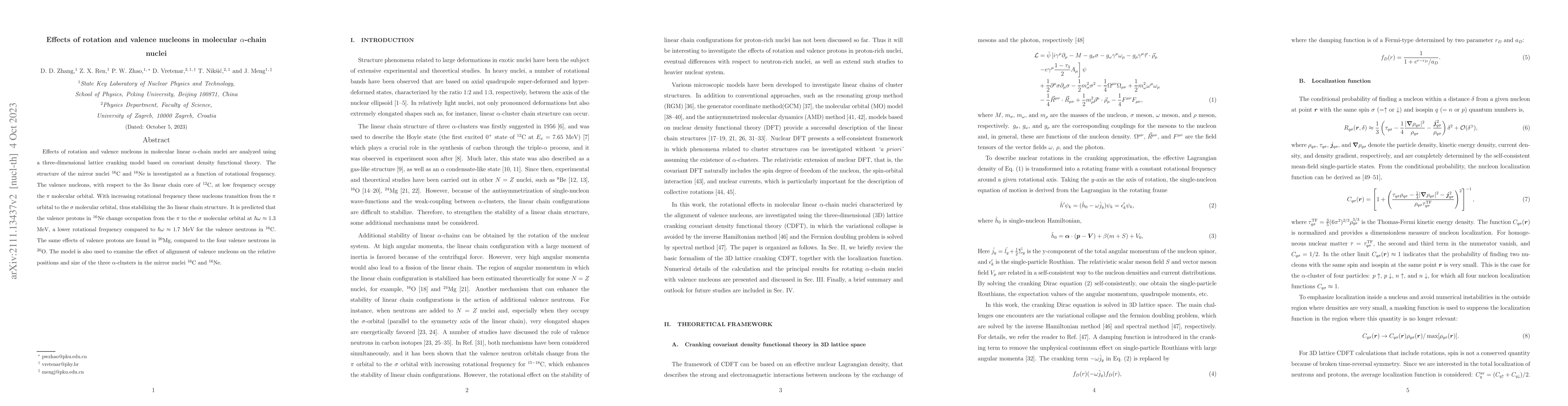 Effects of rotation and valence nucleons in molecular-like linear $\alpha$-chain nuclei are analyzed using a three-dimensional lattice cranking model based on covariant density functional theory. The structure of $^{16}$C and $^{16}$Ne is investigated as a function of rotational frequency. The valence nucleons, with respect to the 3$\alpha$ linear chain core of $^{12}$C, at low frequency occupy the $\pi$ molecular orbital. With increasing rotational frequency these nucleons transition from the $\pi$ orbital to the $\sigma$ molecular orbital, thus stabilizing the 3$\alpha$ linear chain structure. It is predicted that the valence protons in $^{16}$Ne change occupation from the $\pi$ to the $\sigma$ molecular orbital at $\hbar\omega \approx 1.3$ MeV, a lower rotational frequency compared to $\hbar\omega \approx 1.7$ MeV for the valence neutrons in $^{16}$C. The same effects of valence protons are found in $^{20}$Mg, compared to the four valence neutrons in $^{20}$O. The model is also used to examine the effect of alignment of valence nucleons on the relative positions and size of the three $\alpha$-clusters in $^{16}$C and $^{16}$Ne.