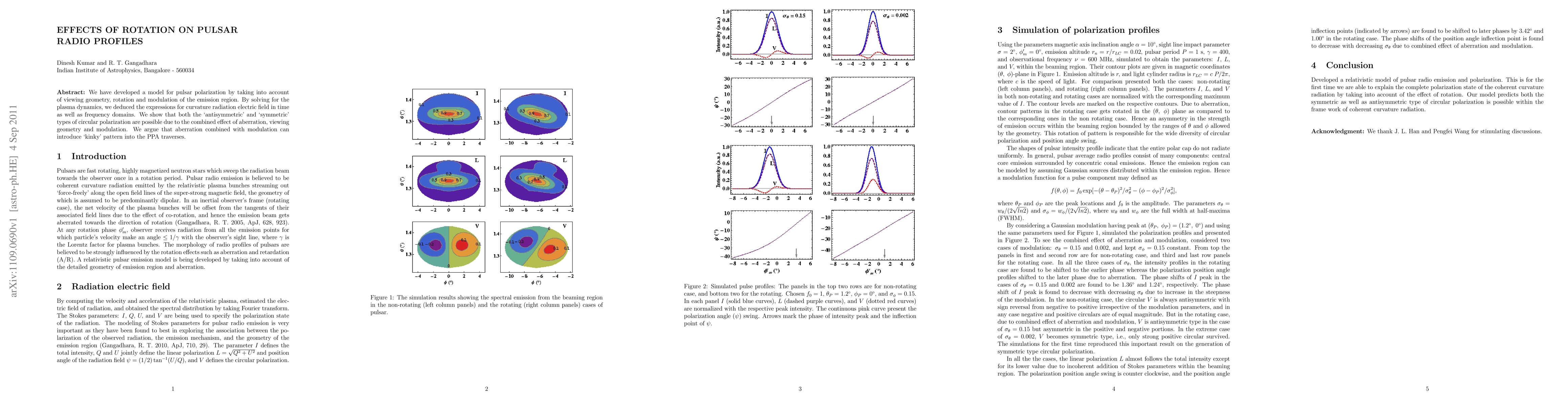We have developed a model for pulsar polarization by taking into account of viewing geometry, rotation and modulation of the emission region. By solving for the plasma dynamics, we deduced the expressions for curvature radiation electric field in time as well as frequency domains. We show that both the 'antisymmetric' and 'symmetric' types of circular polarization are possible due to the combined effect of aberration, viewing geometry and modulation. We argue that aberration combined with modulation can introduce 'kinky' pattern into the PPA traverses.
