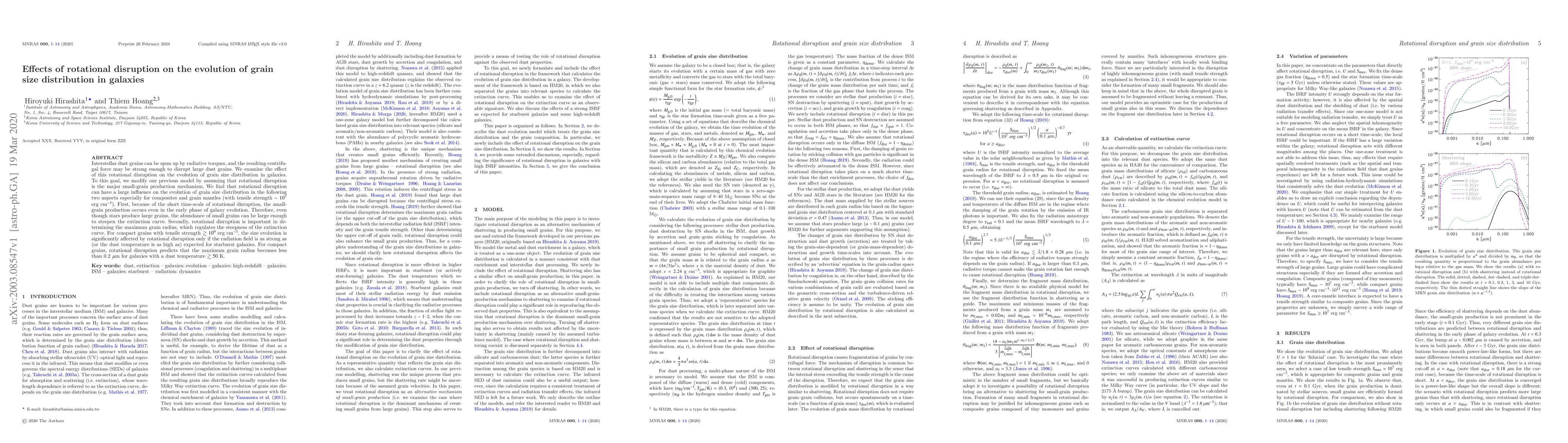 This paper investigates how rotational disruption of interstellar dust grains affects the evolution of grain size distribution in galaxies. The study finds that rotational disruption significantly influences the early phase of small-grain production and determines the maximum grain radius, thereby regulating the steepness of the extinction curve.