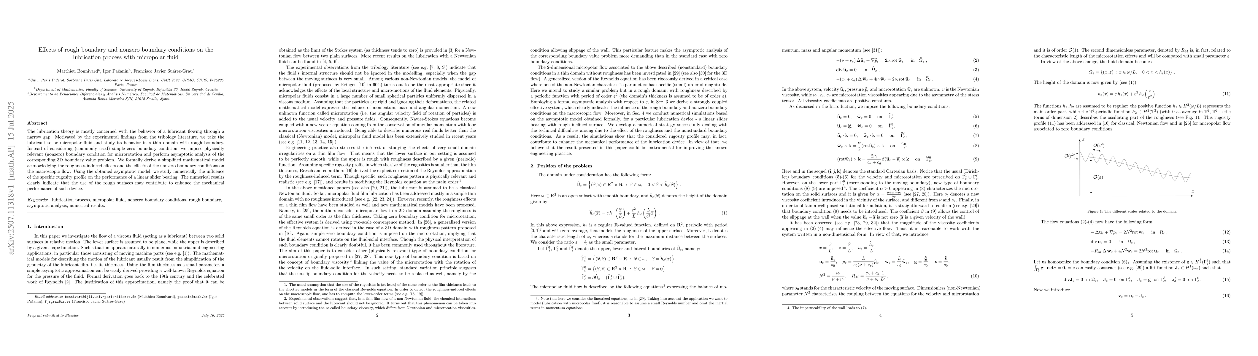 The lubrication theory is mostly concerned with the behavior of a lubricant flowing through a narrow gap. Motivated by the experimental findings from the tribology literature, we take the lubricant to be micropolar fluid and study its behavior in a thin domain with rough boundary. Instead of considering (commonly used) simple zero boundary condition, we impose physically relevant (nonzero) boundary condition for microrotation and perform asymptotic analysis of the corresponding 3D boundary value problem. We formally derive a simplified mathematical model acknowledging the roughness-induced effects and the effects of the nonzero boundary conditions on the macroscopic flow. Using the obtained asymptotic model, we study numerically the influence of the specific rugosity profile on the performance of a linear slider bearing. The numerical results clearly indicate that the use of the rough surfaces may contribute to enhance the mechanical performance of such device.