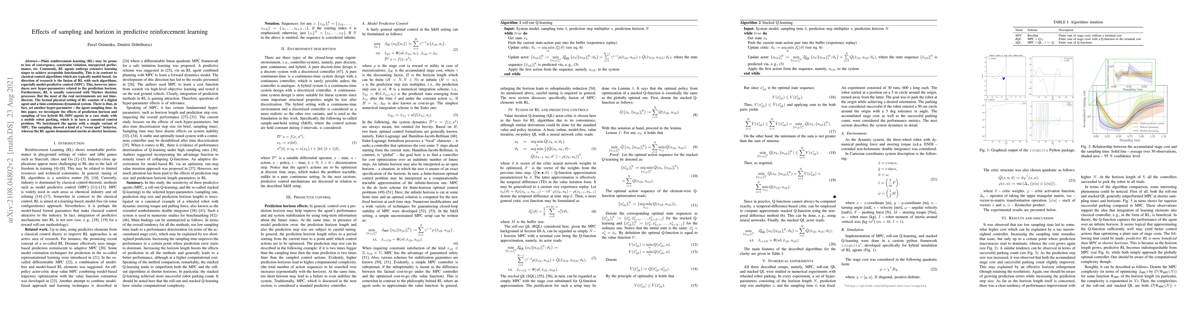 Plain reinforcement learning (RL) may be prone to loss of convergence, constraint violation, unexpected performance, etc. Commonly, RL agents undergo extensive learning stages to achieve acceptable functionality. This is in contrast to classical control algorithms which are typically model-based. An direction of research is the fusion of RL with such algorithms, especially model-predictive control (MPC). This, however, introduces new hyper-parameters related to the prediction horizon. Furthermore, RL is usually concerned with Markov decision processes. But the most of the real environments are not time-discrete. The factual physical setting of RL consists of a digital agent and a time-continuous dynamical system. There is thus, in fact, yet another hyper-parameter -- the agent sampling time. In this paper, we investigate the effects of prediction horizon and sampling of two hybrid RL-MPC-agents in a case study with a mobile robot parking, which is in turn a canonical control problem. We benchmark the agents with a simple variant of MPC. The sampling showed a kind of a "sweet spot" behavior, whereas the RL agents demonstrated merits at shorter horizons.
