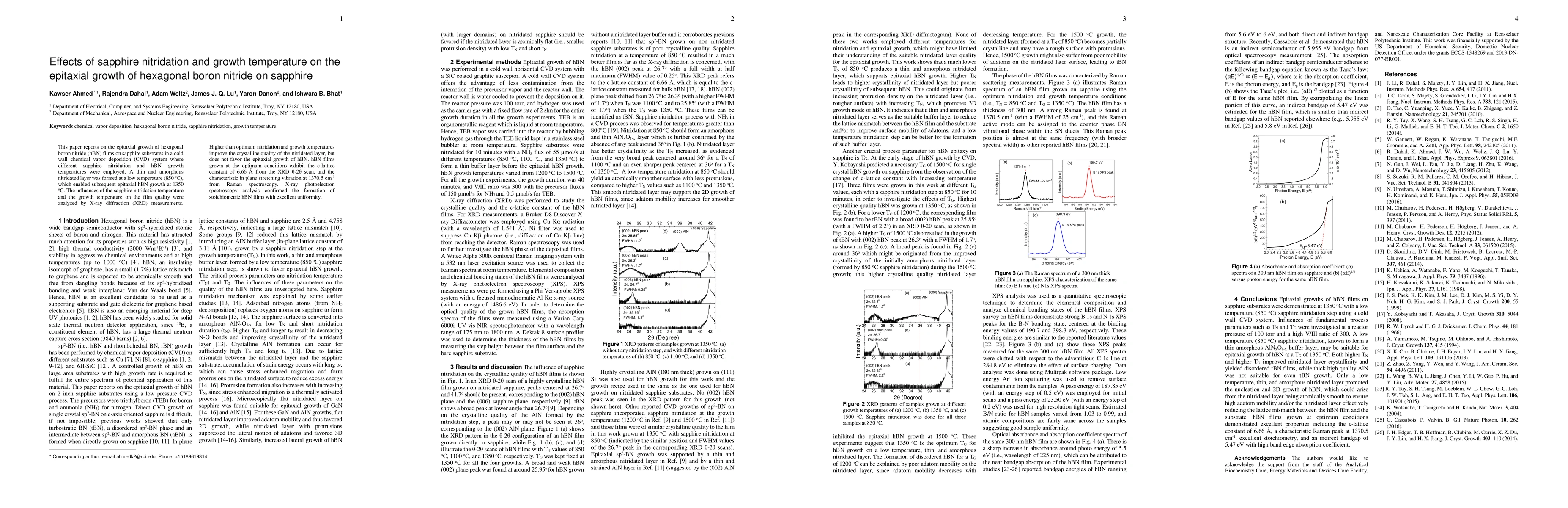 This study investigates the impact of sapphire nitridation and growth temperatures on the epitaxial growth of hexagonal boron nitride (hBN) films via chemical vapor deposition, finding that optimal nitridation at low temperatures and growth at 1350°C yield high-quality hBN films with improved c-lattice constant and uniformity.