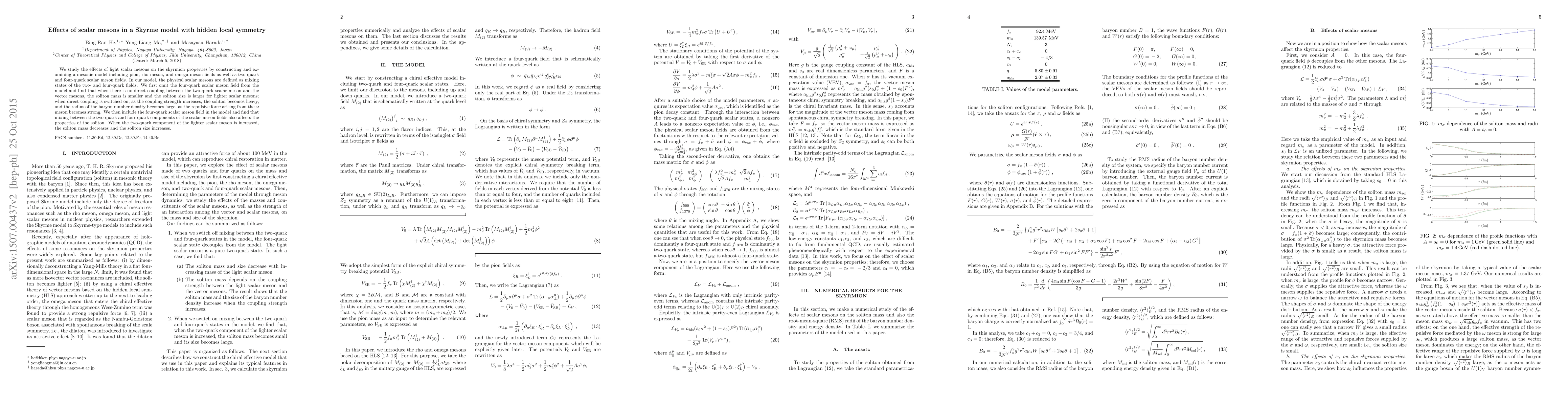 Researchers study how adding light scalar mesons to a model of skyrmions affects their mass and size, finding that heavier mesons lead to heavier skyrmions with larger sizes.