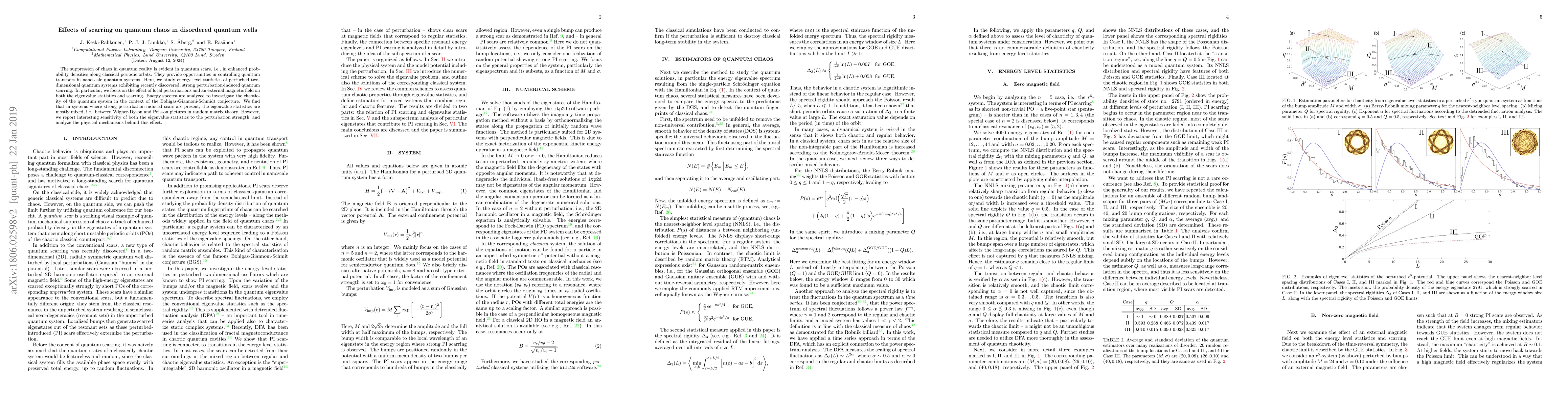 This paper investigates the impact of local perturbations and magnetic fields on quantum chaos in disordered quantum wells, focusing on quantum scarring effects. It finds that perturbation-induced quantum scarring is pronounced in fully chaotic classical systems but leads to mixed eigenvalue statistics in quantum systems, challenging the Bohigas-Giannoni-Schmidt conjecture.