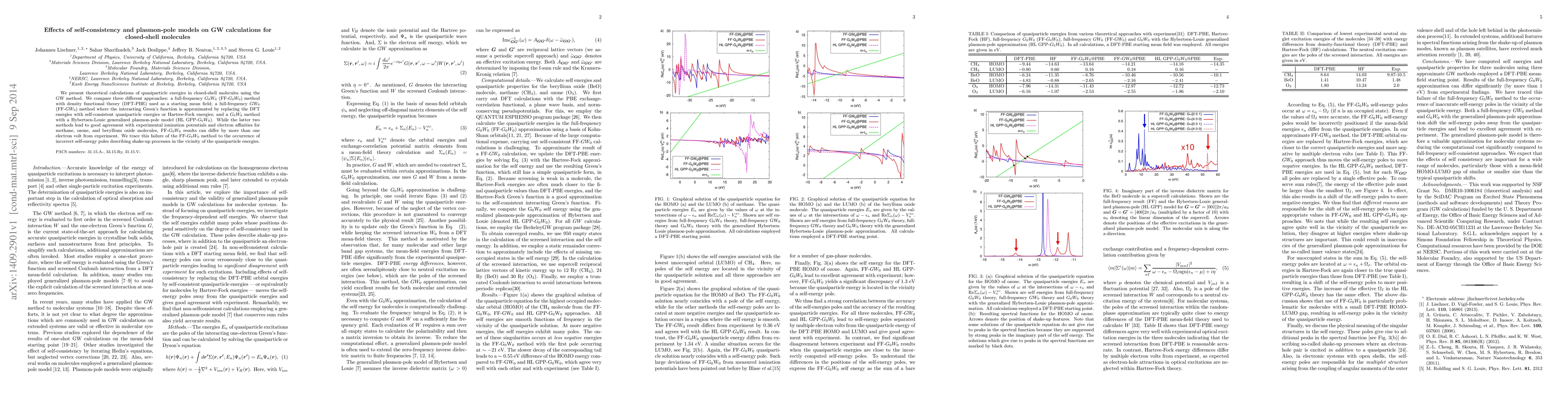 We present theoretical calculations of quasiparticle energies in closed-shell molecules using the GW method. We compare three different approaches: a full-frequency $G_0W_0$ (FF-$G_0W_0$) method with density functional theory (DFT-PBE) used as a starting mean field; a full-frequency $GW_0$ (FF-$GW_0$) method where the interacting Green's function is approximated by replacing the DFT energies with self-consistent quasiparticle energies or Hartree-Fock energies; and a $G_0W_0$ method with a Hybertsen-Louie generalized plasmon-pole model (HL GPP-$G_0W_0$). While the latter two methods lead to good agreement with experimental ionization potentials and electron affinities for methane, ozone, and beryllium oxide molecules, FF-$G_0W_0$ results can differ by more than one electron volt from experiment. We trace this failure of the FF-$G_0W_0$ method to the occurrence of incorrect self-energy poles describing shake-up processes in the vicinity of the quasiparticle energies.
