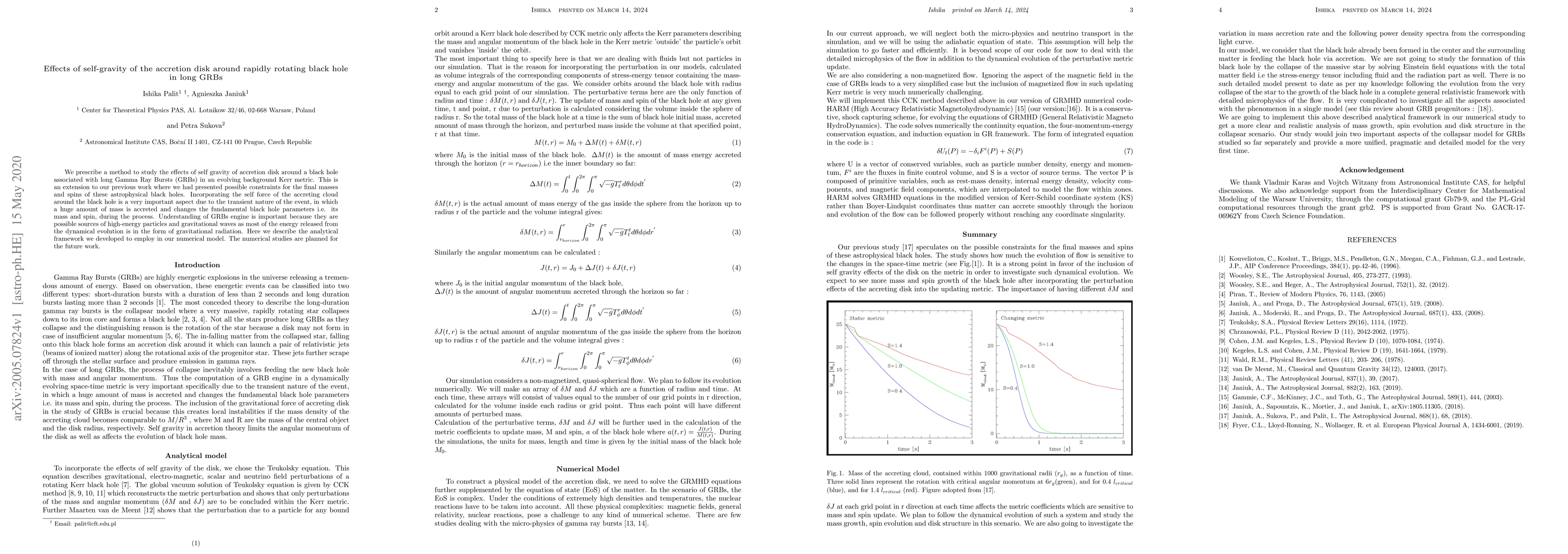 This paper proposes a method to analyze the self-gravity effects of accretion disks around rapidly rotating black holes linked to long Gamma Ray Bursts (GRBs). The study extends previous work on constraining black hole mass and spin, considering the self-force of the accreting matter due to its transient nature. The authors describe an analytical framework for future numerical modeling, emphasizing the importance of understanding GRBs as potential sources of high-energy particles and gravitational waves.