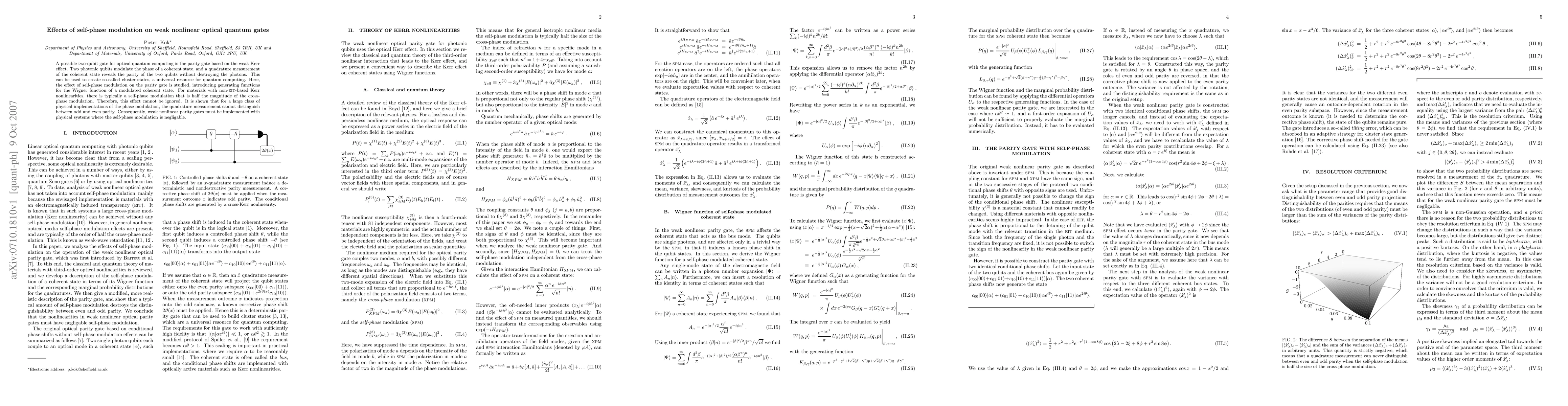 A possible two-qubit gate for optical quantum computing is the parity gate based on the weak Kerr effect. Two photonic qubits modulate the phase of a coherent state, and a quadrature measurement of the coherent state reveals the parity of the two qubits without destroying the photons. This can be used to create so-called cluster states, a universal resource for quantum computing. Here, the effect of self-phase modulation on the parity gate is studied, introducing generating functions for the Wigner function of a modulated coherent state. For materials with non-EIT-based Kerr nonlinearities, there is typically a self-phase modulation that is half the magnitude of the cross-phase modulation. Therefore, this effect cannot be ignored. It is shown that for a large class of physical implementations of the phase modulation, the quadrature measurement cannot distinguish between odd and even parity. Consequently, weak nonlinear parity gates must be implemented with physical systems where the self-phase modulation is negligable.