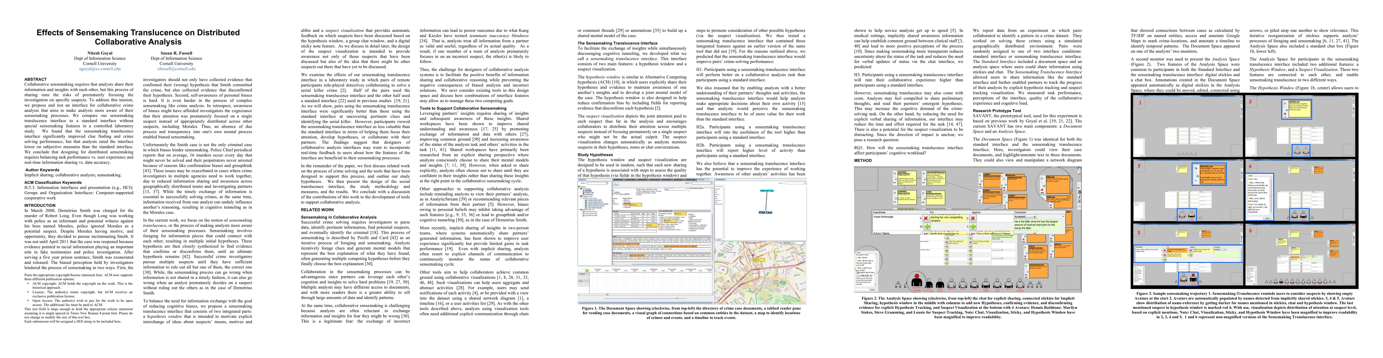 This study investigates a sensemaking translucence interface designed to enhance distributed collaborative analysis in crime investigation. Results show improved clue finding and crime solving performance, though the interface was less favorably rated by users compared to a standard interface. The study concludes that balancing task performance and user experience is crucial in designing for collaborative sensemaking.