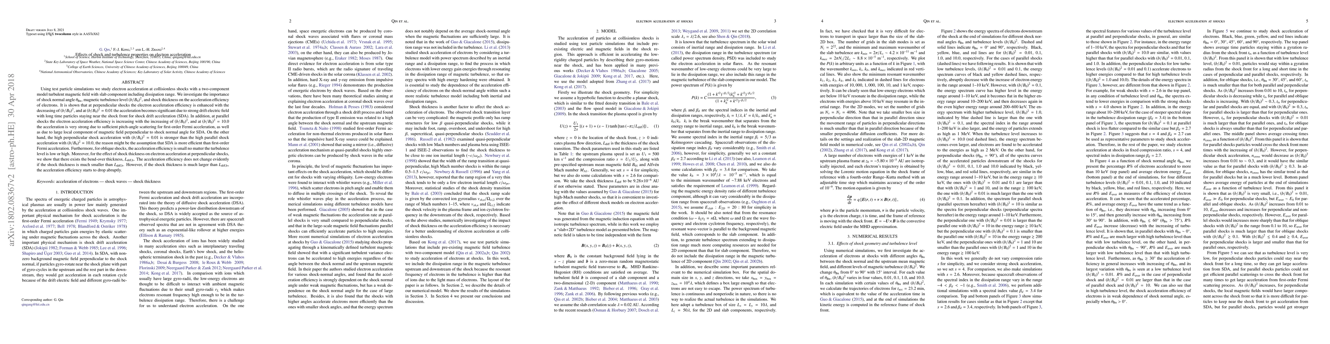 Using test particle simulations we study electron acceleration at collisionless shocks with a two-component model turbulent magnetic field with slab component including dissipation range. We investigate the importance of shock normal angle $\theta_{Bn}$, magnetic turbulence level $\left(b/B_0\right)^2$, and shock thickness on the acceleration efficiency of electrons. It is shown that at perpendicular shocks the electron acceleration efficiency is enhanced with the decreasing of $\left(b/B_0\right)^2$, and at $\left(b/B_0\right)^2=0.01$ the acceleration becomes significant due to strong drift electric field with long time particles staying near the shock front for shock drift acceleration (SDA). In addition, at parallel shocks the electron acceleration efficiency is increasing with the increasing of $\left(b/B_0\right)^2$, and at $\left(b/B_0\right)^2=10.0$ the acceleration is very strong due to sufficient pitch-angle scattering for first-order Fermi acceleration, as well as due to large local component of magnetic field perpendicular to shock normal angle for SDA. On the other hand, the high perpendicular shock acceleration with $\left(b/B_0\right)^2=0.01$ is stronger than the high parallel shock acceleration with ($\left(b/B_0\right)^2=10.0$), the reason might be the assumption that SDA is more efficient than first-order Fermi acceleration. Furthermore, for oblique shocks, the acceleration efficiency is small no matter the turbulence level is low or high. Moreover, for the effect of shock thickness on electron acceleration at perpendicular shocks, we show that there exists the bend-over thickness, $L_{\text{diff,b}}$. The acceleration efficiency does not change evidently if the shock thickness is much smaller than $L_{\text{diff,b}}$. However, if the shock thickness is much larger than $L_{\text{diff,b}}$, the acceleration efficiency starts to drop abruptly.