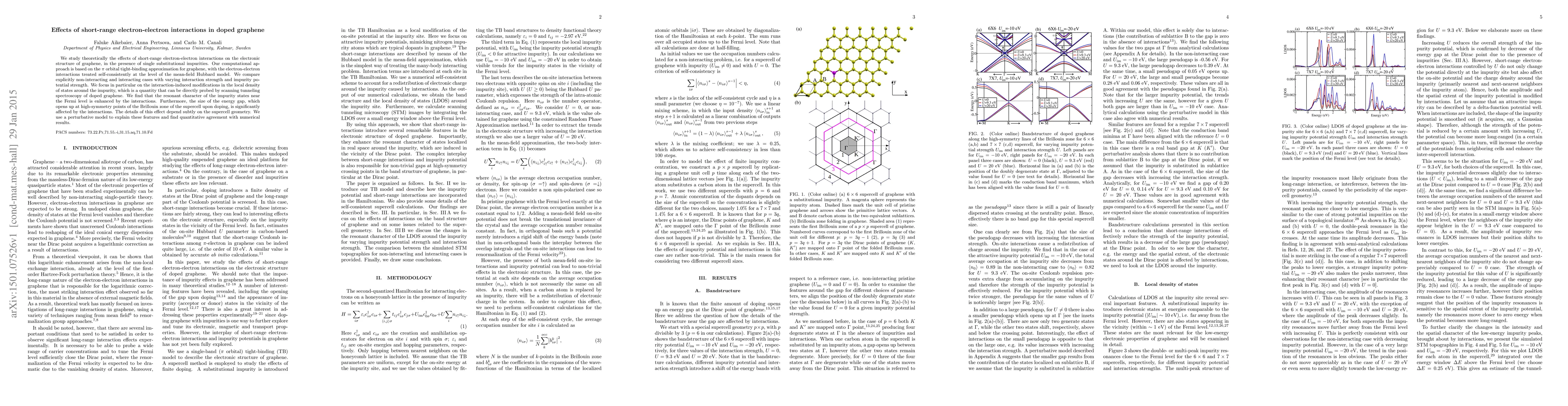 This study theoretically investigates how short-range electron-electron interactions in doped graphene, especially near single substitutional impurities, modify the electronic structure. It finds that interactions enhance the resonant character of impurity states near the Fermi level and significantly affect the energy gap at high-symmetry points, with detailed effects depending on supercell geometry.