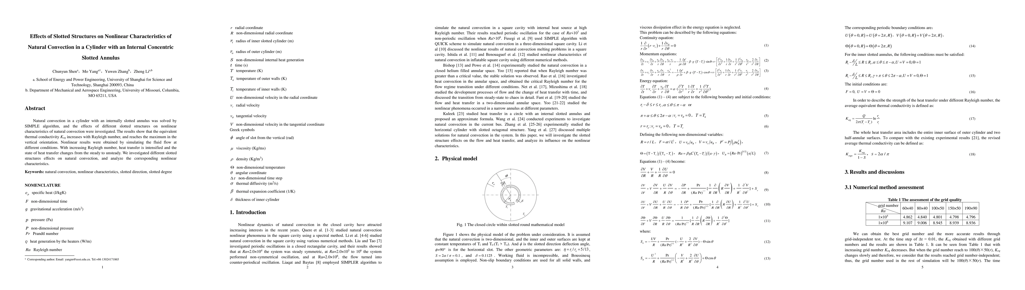 Natural convection in a cylinder with an internally slotted annulus was solved by SIMPLE algorithm, and the effects of different slotted structures on nonlinear characteristics of natural convection were investigated. The results show that the equivalent thermal conductivity Keq increases with Rayleigh number, and reaches the maximum in the vertical orientation. Nonlinear results were obtained by simulating the fluid flow at different conditions. With increasing Rayleigh number, heat transfer is intensified and the state of heat transfer changes from the steady to unsteady. We investigated different slotted structures effects on natural convection, and analyze the corresponding nonlinear characteristics.