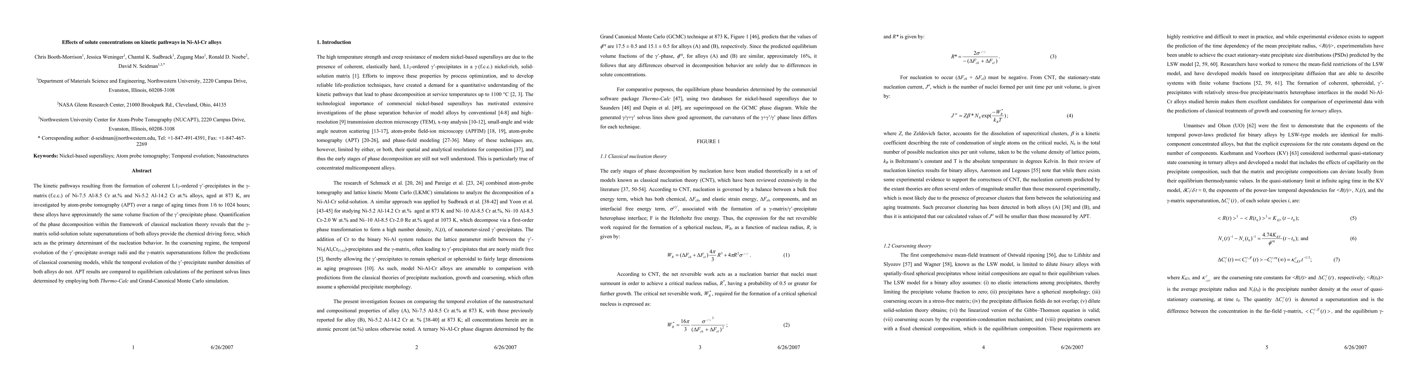 The kinetic pathways resulting from the formation of coherent L12-ordered y'-precipitates in the g-matrix (f.c.c.) of Ni-7.5 Al-8.5 Cr at.% and Ni-5.2 Al-14.2 Cr at.% alloys, aged at 873 K, are investigated by atom-probe tomography (APT) over a range of aging times from 1/6 to 1024 hours; these alloys have approximately the same volume fraction of the y'-precipitate phase. Quantification of the phase decomposition within the framework of classical nucleation theory reveals that the y-matrix solid-solution solute supersaturations of both alloys provide the chemical driving force, which acts as the primary determinant of the nucleation behavior. In the coarsening regime, the temporal evolution of the y'-precipitate average radii and the y-matrix supersaturations follow the predictions of classical coarsening models, while the temporal evolution of the y'-precipitate number densities of both alloys do not. APT results are compared to equilibrium calculations of the pertinent solvus lines determined by employing both Thermo-Calc and Grand-Canonical Monte Carlo simulation.