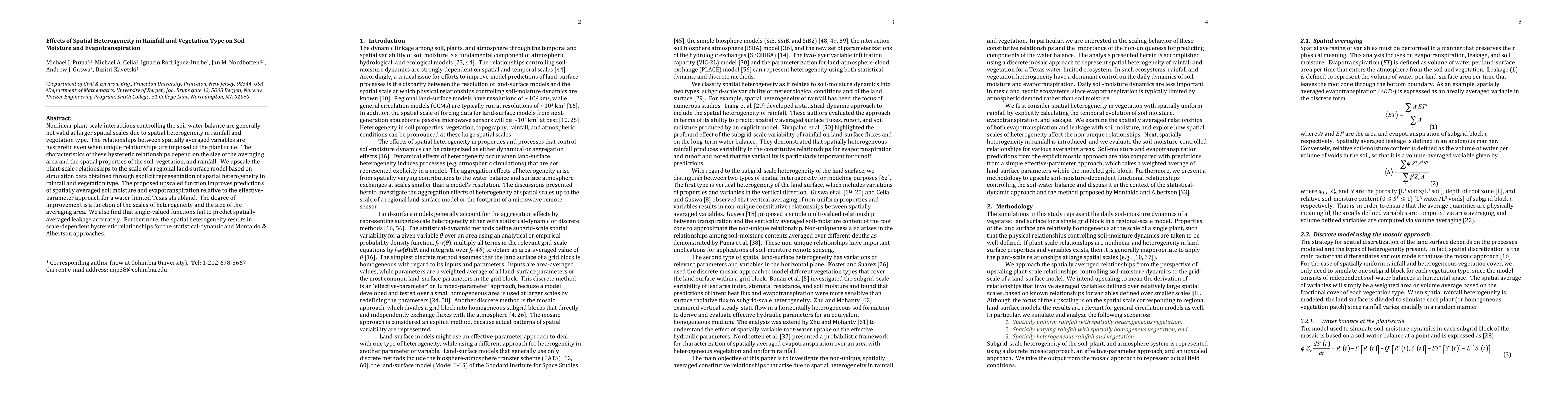 This work distinguishes itself by explicitly representing spatial heterogeneity in rainfall and vegetation type, identifying hysteretic relationships and their scale-dependency, and proposing an improved upscaled function for regional land-surface models.