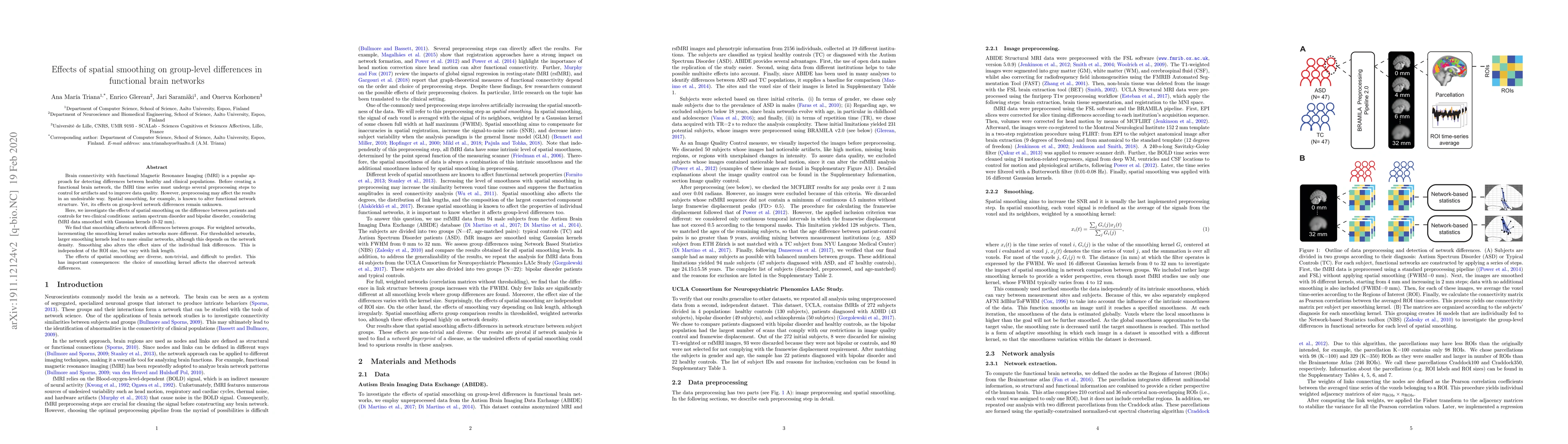This study examines the impact of spatial smoothing on group-level differences in functional brain networks derived from fMRI data, finding that smoothing alters network differences between patients with autism spectrum disorder and bipolar disorder. The effects are complex and depend on the smoothing kernel size and network thresholding method.