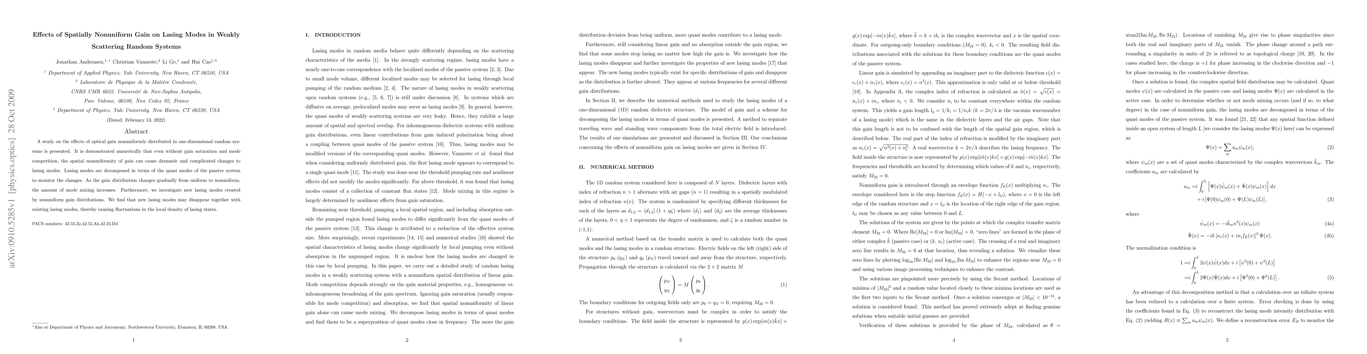 This paper investigates how spatially nonuniform optical gain in one-dimensional random systems affects lasing modes, demonstrating numerically that nonuniform gain can lead to significant changes in lasing modes even without gain saturation. The study finds that as the gain distribution becomes more nonuniform, the amount of mode mixing increases, and new lasing modes can emerge or disappear, causing fluctuations in the local density of lasing states.