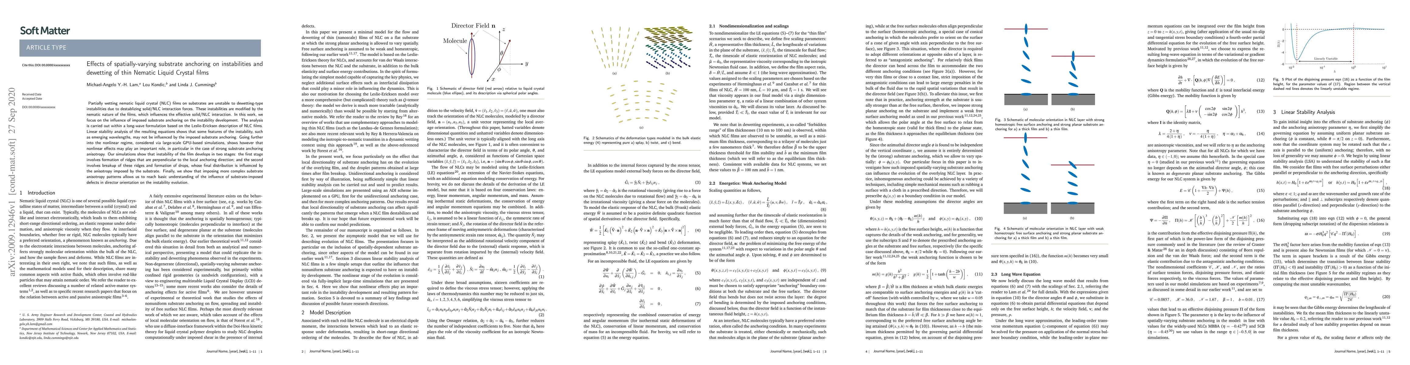 This study explores how spatially-varying substrate anchoring influences the dewetting instabilities in thin nematic liquid crystal films. While linear stability analysis indicates that some instability features remain unaffected by anchoring, nonlinear simulations reveal that strong anchoring anisotropy significantly impacts the instability's development, leading to distinct ridge formation and subsequent droplet breakup.