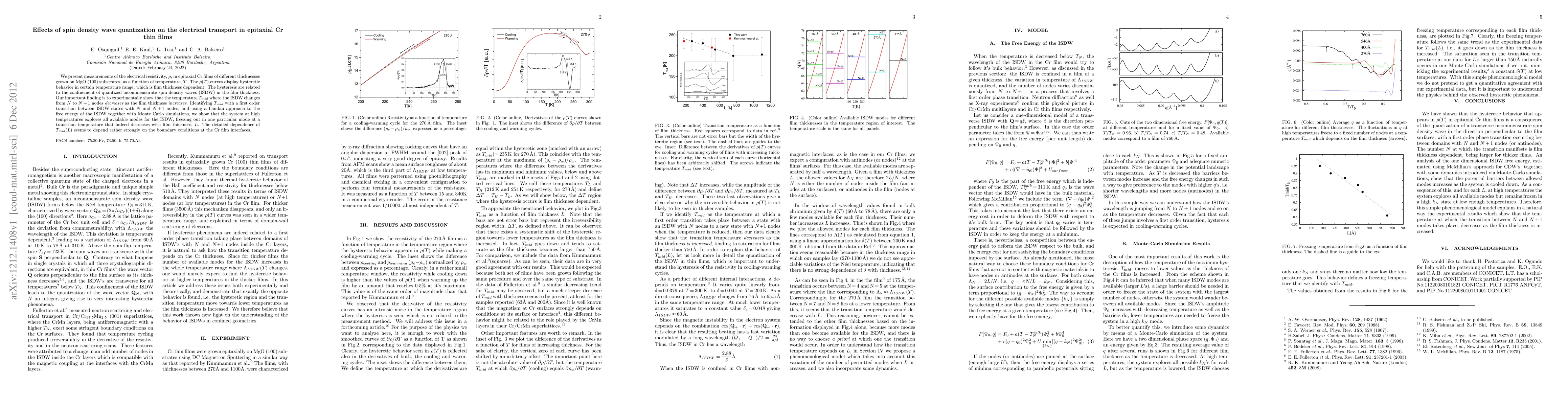 This study investigates the electrical resistivity of epitaxial Cr films on MgO substrates, revealing hysteretic behavior linked to quantized spin density waves. The key finding is that the transition temperature for the spin density wave changes decreases with increasing film thickness, influenced by boundary conditions at the interfaces.