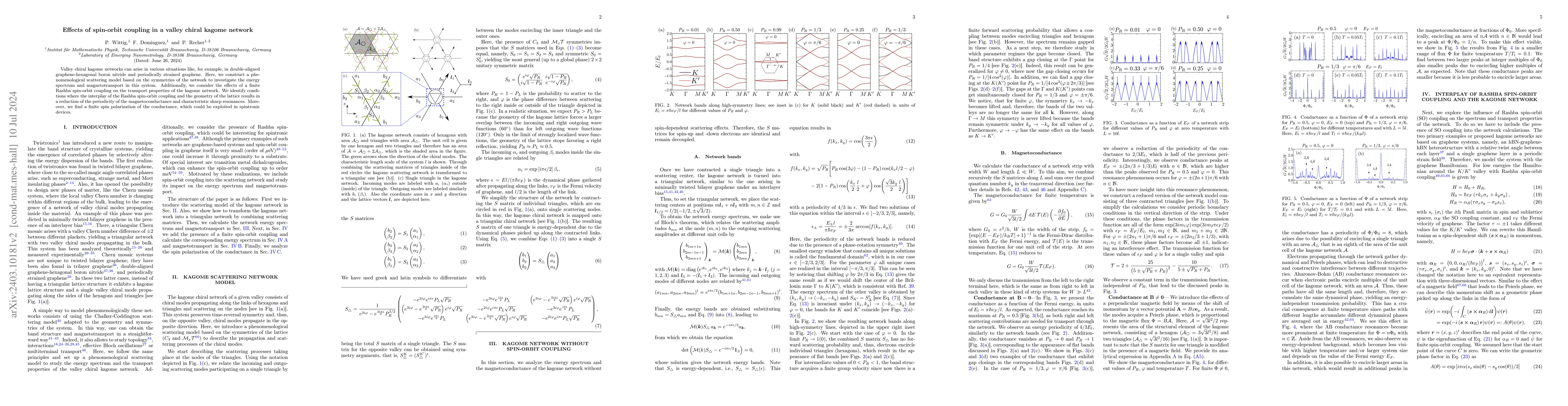 Valley chiral kagom\'e networks can arise in various situations, like for example, in double-aligned graphene-hexagonal boron nitride and periodically strained graphene. Here, we construct a phenomenological scattering model based on the symmetries of the network to investigate the energy spectrum and magnetotransport in this system. Additionally, we consider the effects of a finite Rashba spin-orbit coupling on the transport properties of the kagom\'e network. We identify conditions where the interplay of the Rashba spin-orbit coupling and the geometry of the lattice results in a reduction of the periodicity of the magnetoconductance and characteristic sharp resonances. Moreover, we find a finite spin-polarization of the conductance, which could be exploited in spintronic devices.
