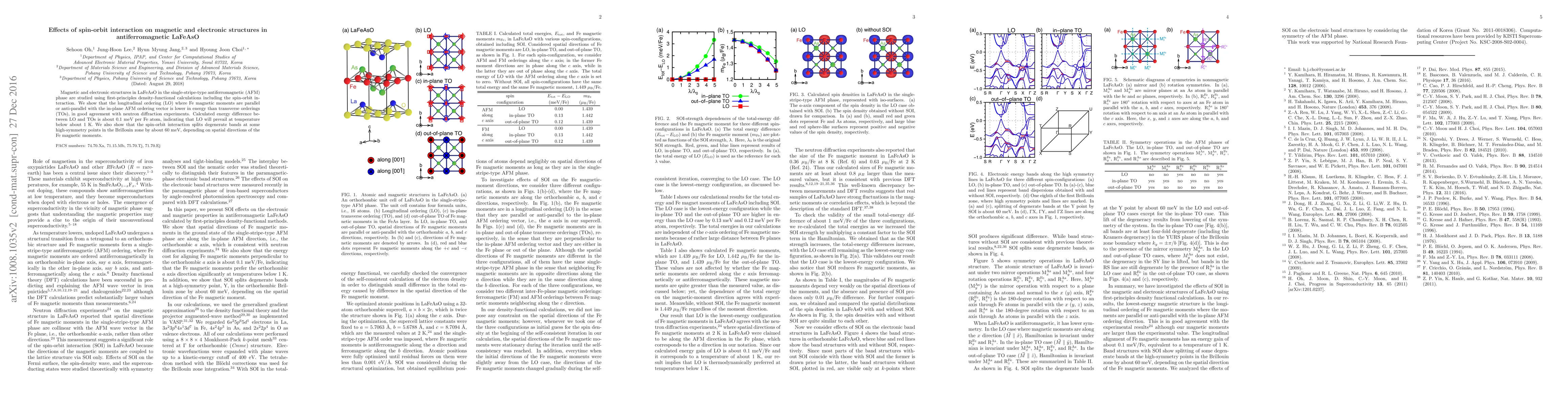 This study uses first-principles calculations to investigate the magnetic and electronic structures of antiferromagnetic LaFeAsO, finding that longitudinal ordering is lower in energy than transverse ordering, consistent with experiments. The spin-orbit interaction splits degenerate bands by about 60 meV, influencing electronic properties.