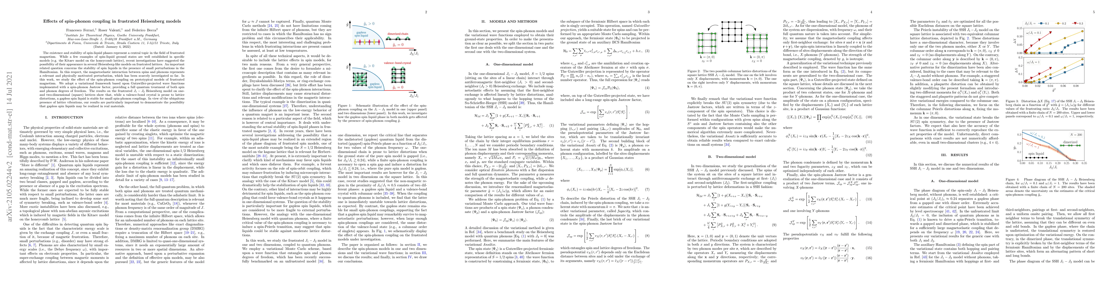 The existence and stability of spin-liquid phases represent a central topic in the field of frustrated magnetism. While a few examples of spin-liquid ground states are well established in specific models (e.g. the Kitaev model on the honeycomb lattice), recent investigations have suggested the possibility of their appearance in several Heisenberg-like models on frustrated lattices. An important related question concerns the stability of spin liquids in the presence of small perturbations in the Hamiltonian. In this respect, the magnetoelastic interaction between spins and phonons represents a relevant and physically motivated perturbation, which has been scarcely investigated so far. In this work, we study the effect of the spin-phonon coupling on prototypical models of frustrated magnetism. We adopt a variational framework based upon Gutzwiller-projected wave functions implemented with a spin-phonon Jastrow factor, providing a full quantum treatment of both spin and phonon degrees of freedom. The results on the frustrated $J_1-J_2$ Heisenberg model on one- and two-dimensional (square) lattices show that, while a valence-bond crystal is prone to lattice distortions, a gapless spin liquid is stable for small spin-phonon couplings. In view of the ubiquitous presence of lattice vibrations, our results are particularly important to demonstrate the possibility that gapless spin liquids may be realized in real materials.