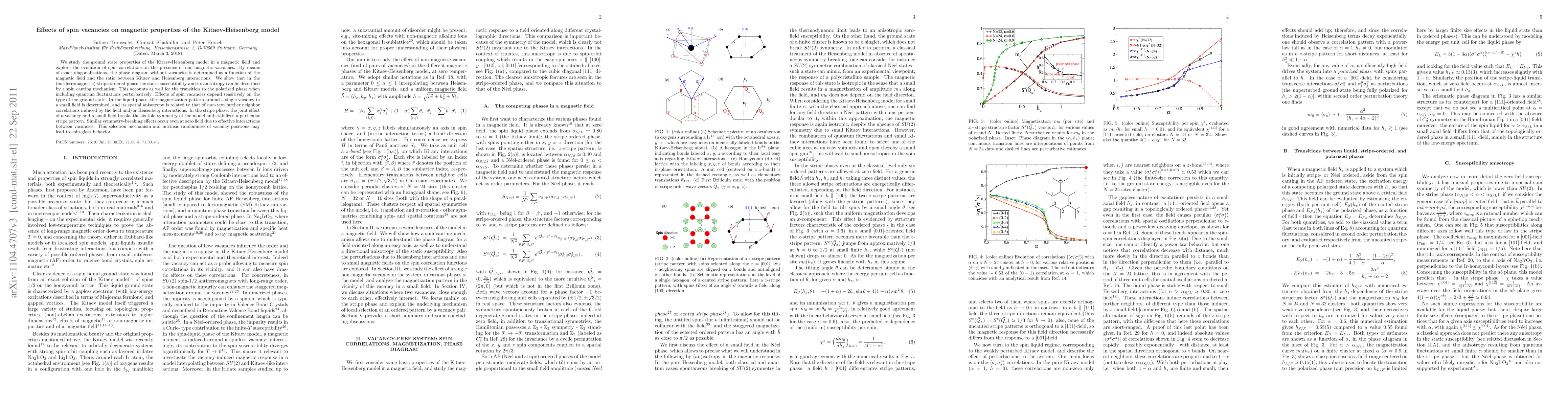 This paper investigates the magnetic properties of the Kitaev-Heisenberg model under a magnetic field, focusing on the impact of spin vacancies. It reveals that vacancies induce complex effects on the model's ground state, leading to spin-glass behavior and symmetry-breaking in the stripe phase.