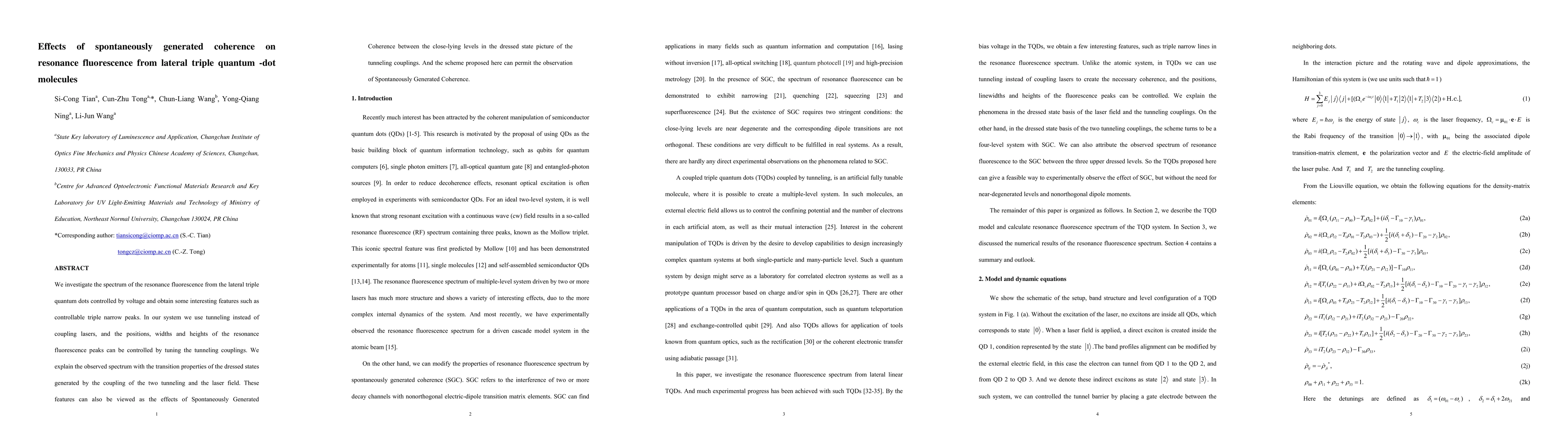 This paper explores the resonance fluorescence from lateral triple quantum dot molecules, revealing controllable triple narrow peaks through voltage-tuned tunneling. The observed spectrum is explained by the transition properties of dressed states, highlighting the effects of Spontaneously Generated Coherence between close-lying levels, which can be observed via the proposed scheme.