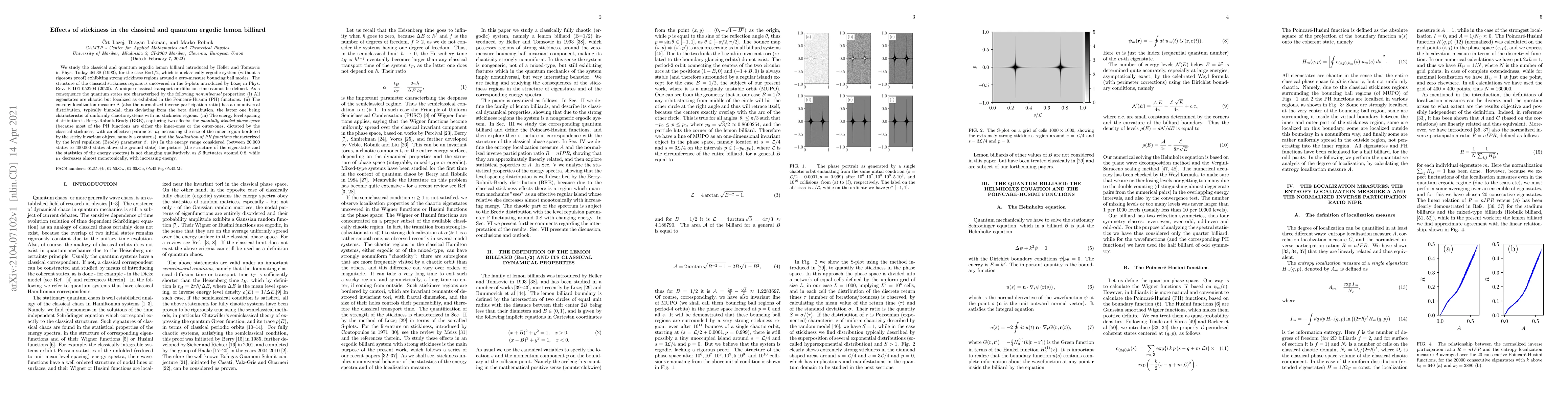 We study the classical and quantum ergodic lemon billiard introduced by Heller and Tomsovic in Phys. Today 46(7), 38 (1993), for the case $B=1/2$, which is a classically ergodic system (without a rigorous proof) exhibiting strong stickiness regions around a zero-measure bouncing ball modes. The structure of the classical stickiness regions is uncovered in the S-plots introduced by Lozej [Phys. Rev. E 101, 052204 (2020)]. A unique classical transport or diffusion time cannot be defined. As a consequence the quantum states are characterized by the following nonuniversal properties: (i) All eigenstates are chaotic but localized as exhibited in the Poincar\'e-Husimi (PH) functions. (ii) The entropy localization measure A (also the normalized inverse participation ratio) has a nonuniversal distribution, typically bimodal, thus deviating from the beta distribution, the latter one being characteristic of uniformly chaotic systems with no stickiness regions. (iii) The energy-level spacing distribution is Berry-Robnik-Brody (BRB), capturing two effects: the quantally divided phase space (because most of the PH functions are either the inner-ones or the outer-ones, dictated by the classical stickiness, with an effective parameter $\mu_1$ measuring the size of the inner region bordered by the sticky invariant object, namely, a cantorus), and the localization of PH functions characterized by the level repulsion (Brody) parameter $\beta$. (iv) In the energy range considered (between 20 000 states to 400 000 states above the ground state) the picture (the structure of the eigenstates and the statistics of the energy spectra) is not changing qualitatively, as $\beta$ fluctuates around 0.8, while $\mu_1$ decreases almost monotonically, with increasing energy.
