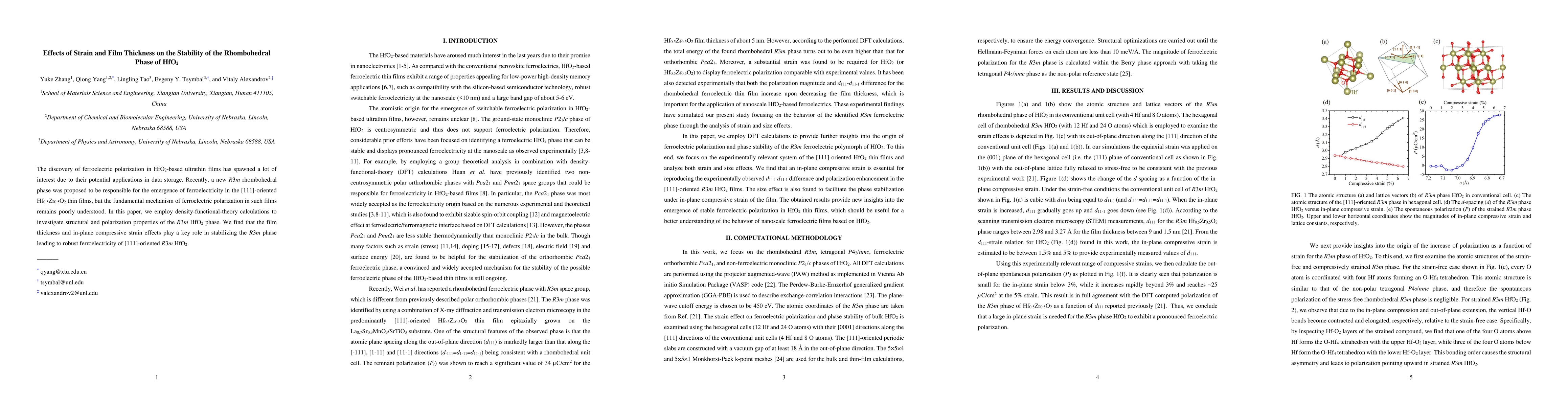 This paper investigates the effects of film thickness and in-plane compressive strain on the stability of the rhombohedral phase in HfO2, revealing that these factors significantly stabilize the R3m phase and enhance ferroelectric polarization, crucial for potential data storage applications. Density-functional-theory calculations underpin these findings.