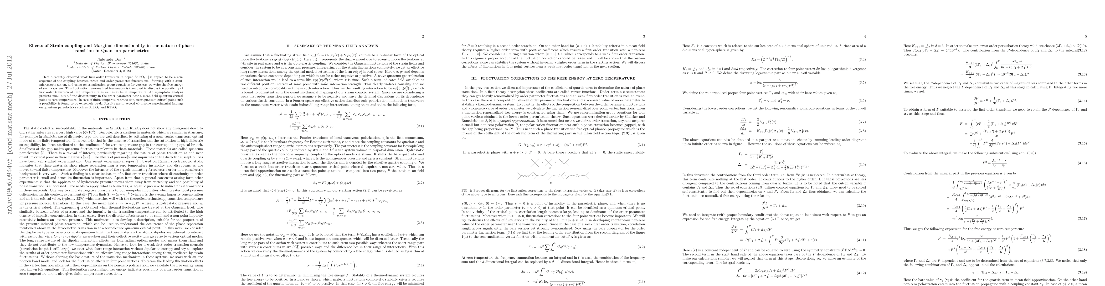 Here a recently observed weak first order transition in doped SrTiO3 is argued to be a consequence of the coupling between strain and order parameter fluctuations. Starting with a semi-microscopic action, and using renormalization group equations for vertices, we write the free energy of such a system. This fluctuation renormalized free energy is then used to discuss the possibility of first order transition at zero temperature as well as at finite temperature. An asymptotic analysis predicts small but a finite discontinuity in the order parameter near a mean field quantum critical point at zero temperature. In case of finite temperature transition, near quantum critical point such a possibility is found to be extremely weak. Results are in accord with some experimental findings on quantum paraelectrics such as SrTiO3 and KTaO3.