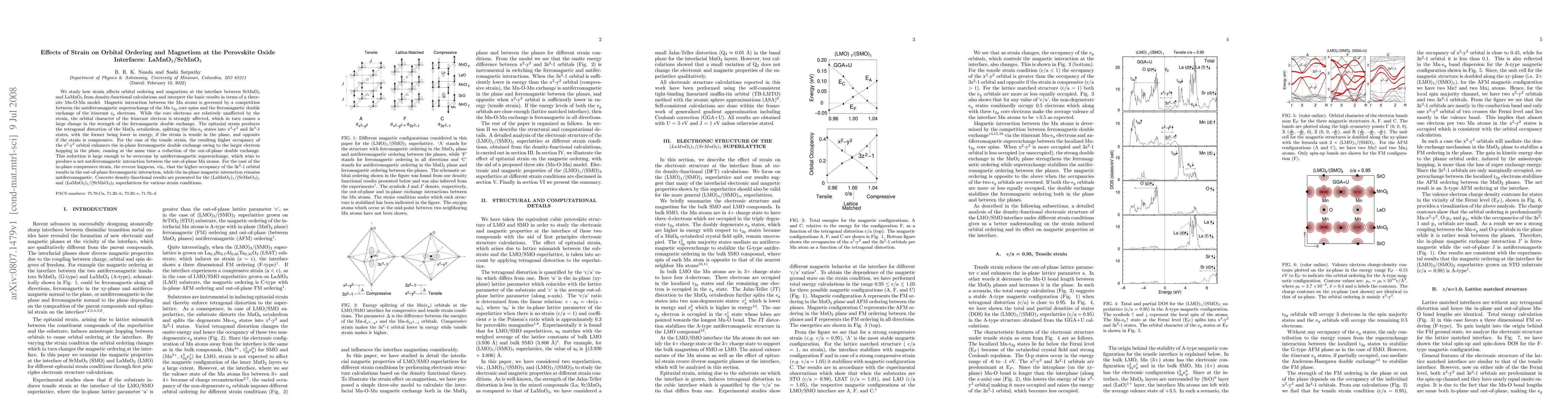 This study investigates how strain influences orbital ordering and magnetism at the interface between LaMnO$_3$ and SrMnO$_3$ perovskite oxides, revealing that tensile strain enhances in-plane ferromagnetic exchange while compressive strain promotes out-of-plane ferromagnetic exchange, altering the overall magnetic interaction.
