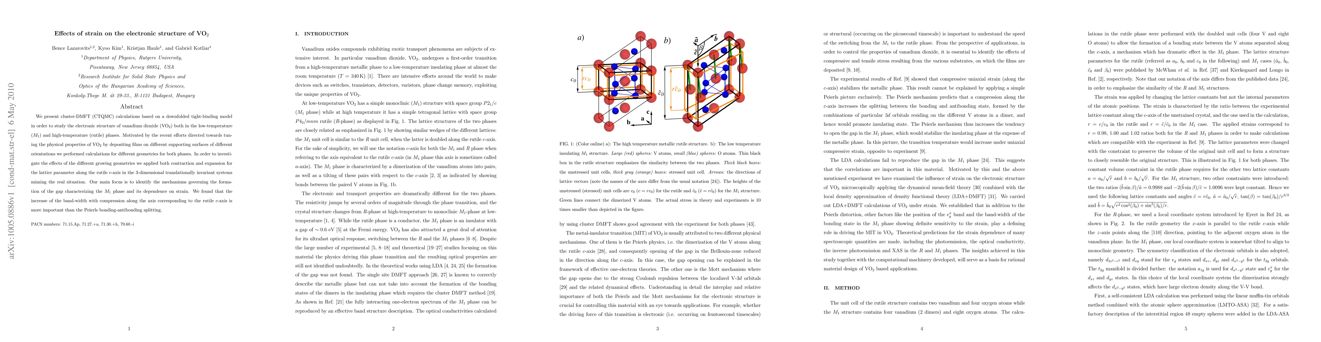 We present cluster-DMFT (CTQMC) calculations based on a downfolded tight-binding model in order to study the electronic structure of vanadium dioxide (VO_2) both in the low-temperature (M_1) and high-temperature (rutile) phases. Motivated by the recent efforts directed towards tuning the physical properties of VO_2 by depositing films on different supporting surfaces of different orientations we performed calculations for different geometries for both phases. In order to investigate the effects of the different growing geometries we applied both contraction and expansion for the lattice parameter along the rutile c-axis in the 3-dimensional translationally invariant systems miming the real situation. Our main focus is to identify the mechanisms governing the formation of the gap characterizing the M_1 phase and its dependence on strain. We found that the increase of the band-width with compression along the axis corresponding to the rutile c-axis is more important than the Peierls bonding-antibonding splitting.