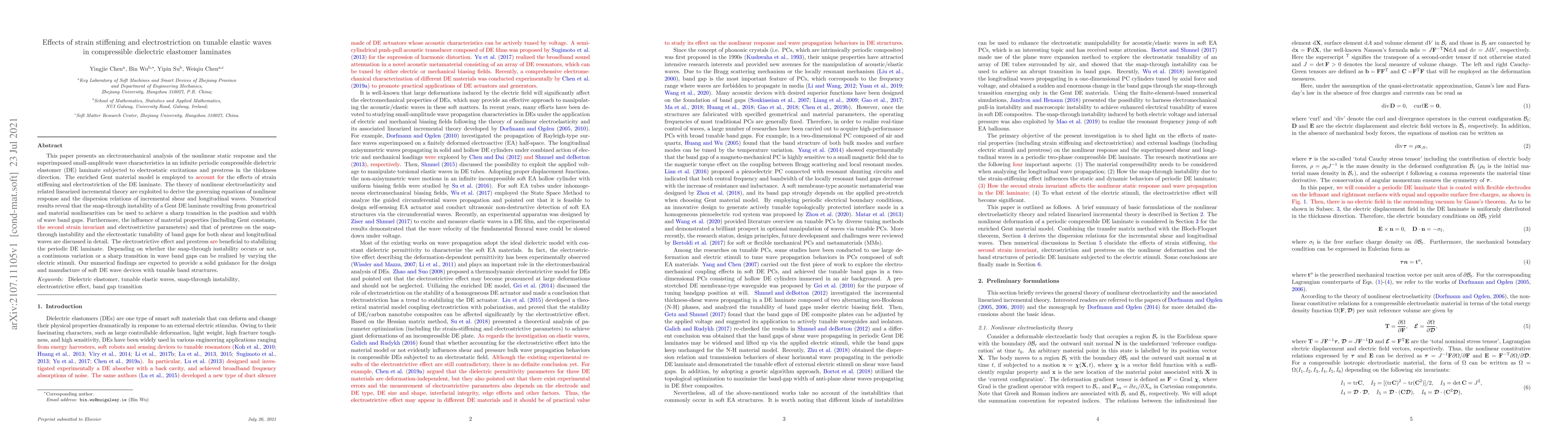 This paper investigates the nonlinear electromechanical response and tunable elastic waves in dielectric elastomer laminates, revealing that strain stiffening and electrostriction can induce snap-through instability, enabling sharp transitions in wave band gaps. The study provides insights into the design of tunable soft wave devices.