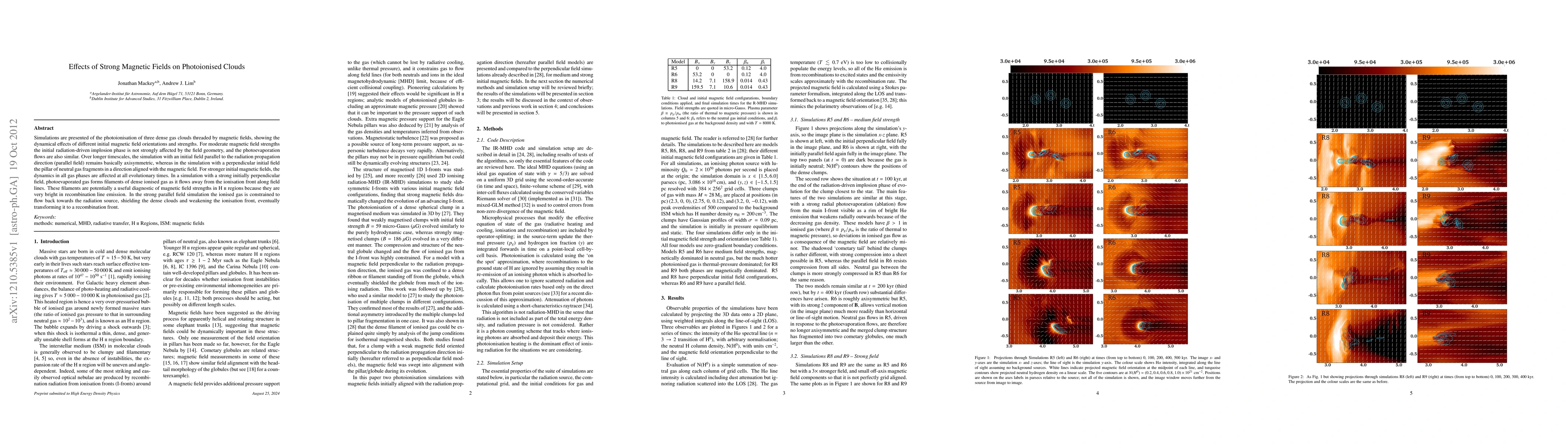 Magnetic fields affect photoionized gas clouds differently depending on their orientation and strength, forming distinct features like filaments of ionized gas or shielding dense clouds.