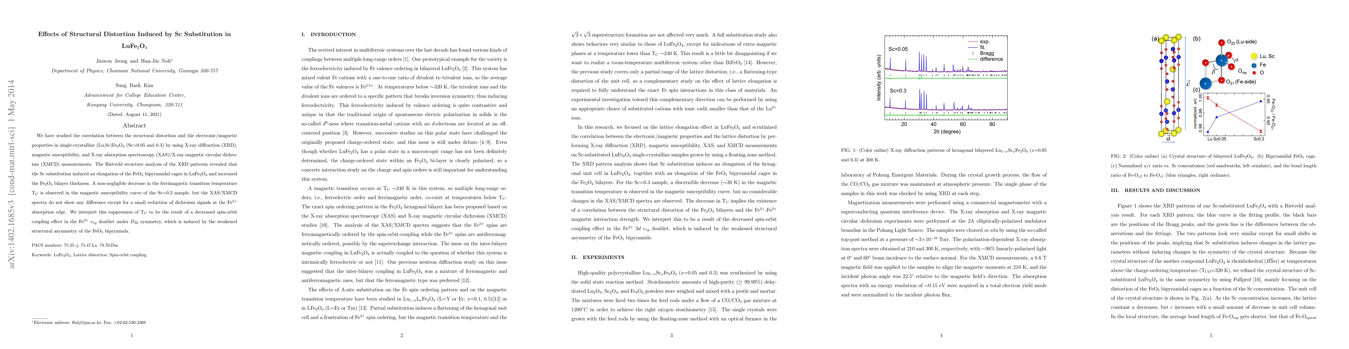 The research investigates the impact of Sc substitution on LuFe$_2$O$_4$'s structure and properties, revealing elongated FeO$_5$ bipyramids and increased bilayer thickness. This structural distortion leads to decreased ferrimagnetic transition temperature T$_C$, interpreted as reduced spin-orbit coupling due to weakened FeO$_5$ bipyramid asymmetry.