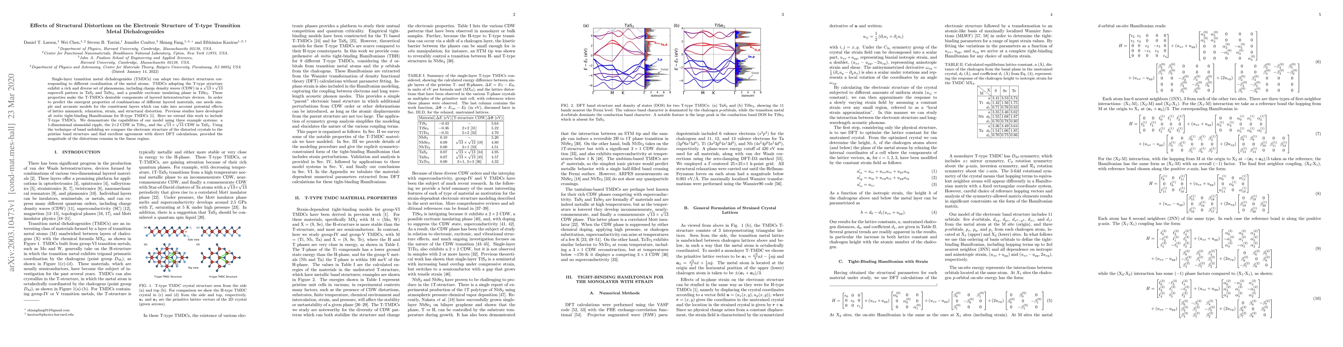 Researchers developed an ab initio tight-binding Hamiltonian model to study T-type transition metal dichalcogenides, predicting their electronic structure with excellent agreement to direct DFT calculations, particularly when distortions remain in the linear regime.