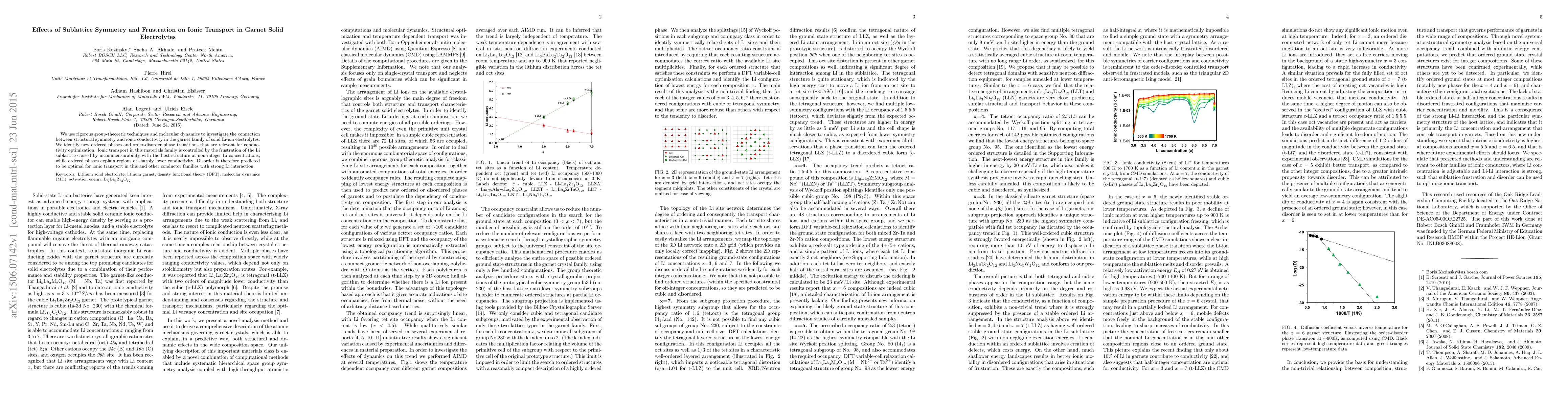 This study employs group-theoretic techniques and molecular dynamics to explore how sublattice symmetry and frustration affect ionic transport in garnet solid electrolytes. The research identifies new ordered phases and phase transitions that influence conductivity, revealing that disordered states are optimal for ionic transport due to the frustration of the Li sublattice.